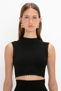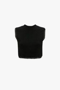 Crafted from a lighter-weight compact knit, this VB Body Tank Top is a summer essential. Designed to be worn as either a crew or V-neck and ideal for layering over shirts and tops, it is endlessly versatile. Scallop-edged armholes and hems add a pretty punctuation. Styled with the VB Body Scallop Trim Flared Skirt, Jumbo Chain Earrings, Mini Chain Pouch and Pointy Toe Stiletto Sandal Product Details - Compact Viscose - Lighter weight compact knit - Cropped length - Designed to be worn alternate ways - Crew or v-neckline - Scallop edging on the armhole and hem - Fits true to size, take your regular size - The model height is 180cm and is wearing a size 6 - 79% Viscose Nylon 21% Nylon Elastane - Specialised Dry Clean Only - Made in China