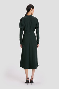 The house’s signature Dolman Midi Dress is refreshed in a rich shade of Dark Pine for the new season. Crafted from a fluid cady fabric for an effortless silhouette, it has elegant long sleeves, a discreet round neckline and softly defined waist. Concealed zips at the wrist and voluminous underarm drape add attractive talking points, while tonal topstitching brings visual interest. Styled with the Harlow Stiletto Size & Fit - Fits true to size, take your regular size - The model height is 5'11"/180cm and is wearing a size UK 6 Product Details - Dolman sleeve - Draped feature at sleeve underarm, fitted sleeve through the forearm - Midi length - Tonal topstitching - Fitted at the waist and more relaxed fit through bodice and hip - 50% Viscose 47% Acetate 3% Elastane - Dry clean only - Made in Portugal