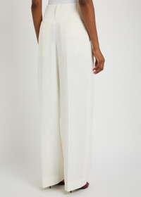 Info & Care Victoria Beckham wool-blend trousers Belt loops, pleats, side slip pockets, back slit pockets, partially lined Concealed hook and zip fastening through side; 50% wool, 50% polyester; lining: 85% polyester, 15% elastane; lining 2: 52% viscose, 48% cotton Dry clean Size & Fit Inside leg length: 32 inches/ 81cm Midweight High-rise fit, slim across the waist Straight-leg cut Model is 5'10"/ 178cm and wears a size;UK8