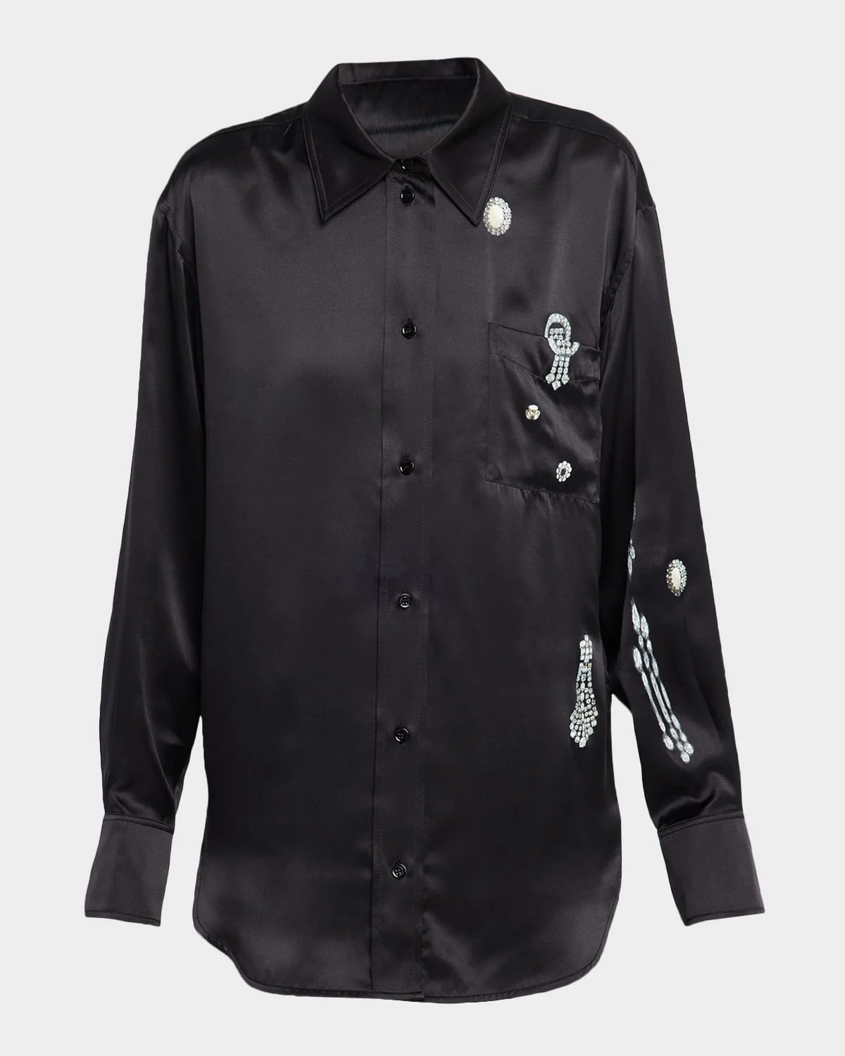 - Victoria Beckham silk pyjama shirt featuring a crystal print - Point collar; button front - Long sleeves; button cuffs - Chets patch pocket - Yoked back; box pleat - Loose fit - Shirttail hem - Silk - Dry clean - Made in Portugal