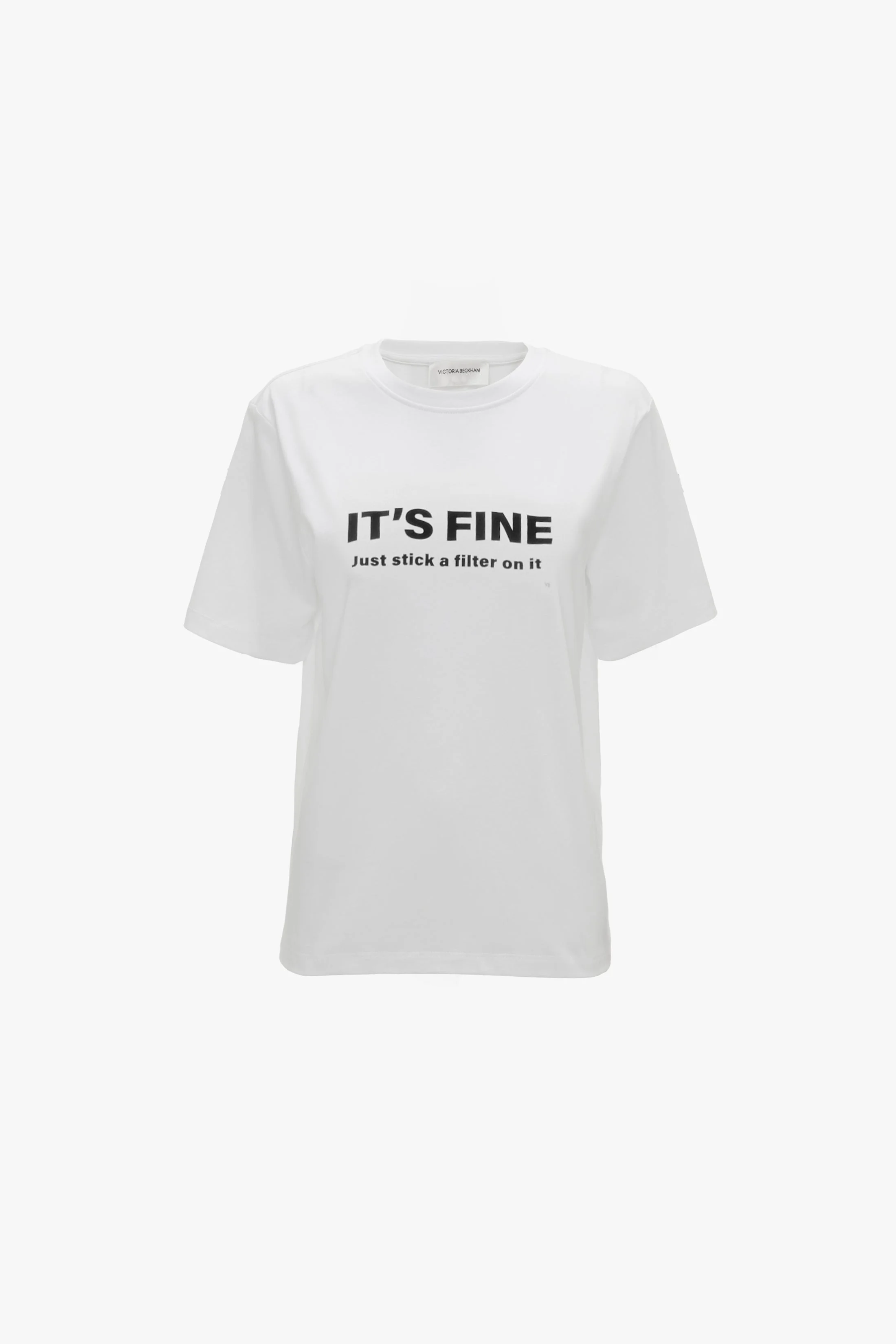 - Classic Victoria T-Shirt - Relaxed fit - VB logo embroidery - Organic cotton - 100% Organic Cotton - Made in Portugal Playful put practical, the Just Stick A Filter On It Slogan T-Shirt is crafted from organic cotton and has a classic Victoria Tee fit. An embroidered Victoria Beckham monogram at the back of the neck completes the look. SIZE & FIT - The model is 5'11’’/180cm and is wearing a size XS - Fits true to size, take your normal size