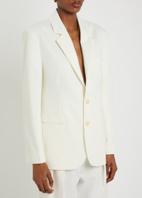 Info & Care Victoria Beckham twill blazer Notched lapels, padded shoulders, button-fastening cuffs, chest slit pocket, darts through waist, two front slit pockets, back vents, internal button-fastening pocket, fully lined Button fastenings at front; 50% wool, 50% polyester; lining: 52% viscose, 48%;cotton Dry clean Size & Fit Length shoulder to hem: 28.5 inches/ 72.5cm Midweight Relaxed fit Model is 5'10"/ 178cm and wears a size;UK8