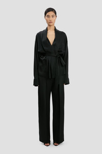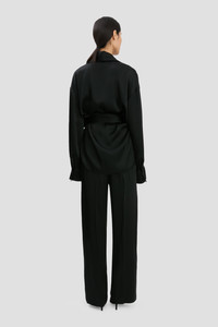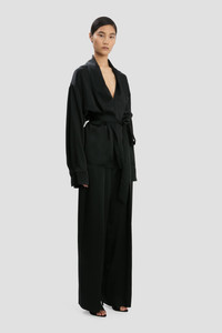 Meticulously tailored from crepe back satin, the Wide Leg Trouser in classic Black offers a distinctly feminine perspective on traditional menswear tailoring. With a high-rise waist, wide leg and structured pleats along the trouser legs, it has an effortlessly elegant silhouette. Side seam pockets, back jet pockets and belt loops have a streamlined effect, while flat piping on the outside legs add an attractive point of difference. Size & Fit - Fits true to size, take your regular size - The model height is 5’10"/178cm and is wearing a size 6 Product Details - Crepe back satin fabrication - High rise - Side pockets - Back jet pockets - 55% Polyester 43% Virgin Wool 2% Elastane - Dry clean only - Made in Portugal