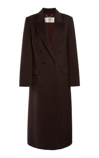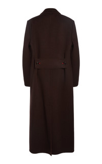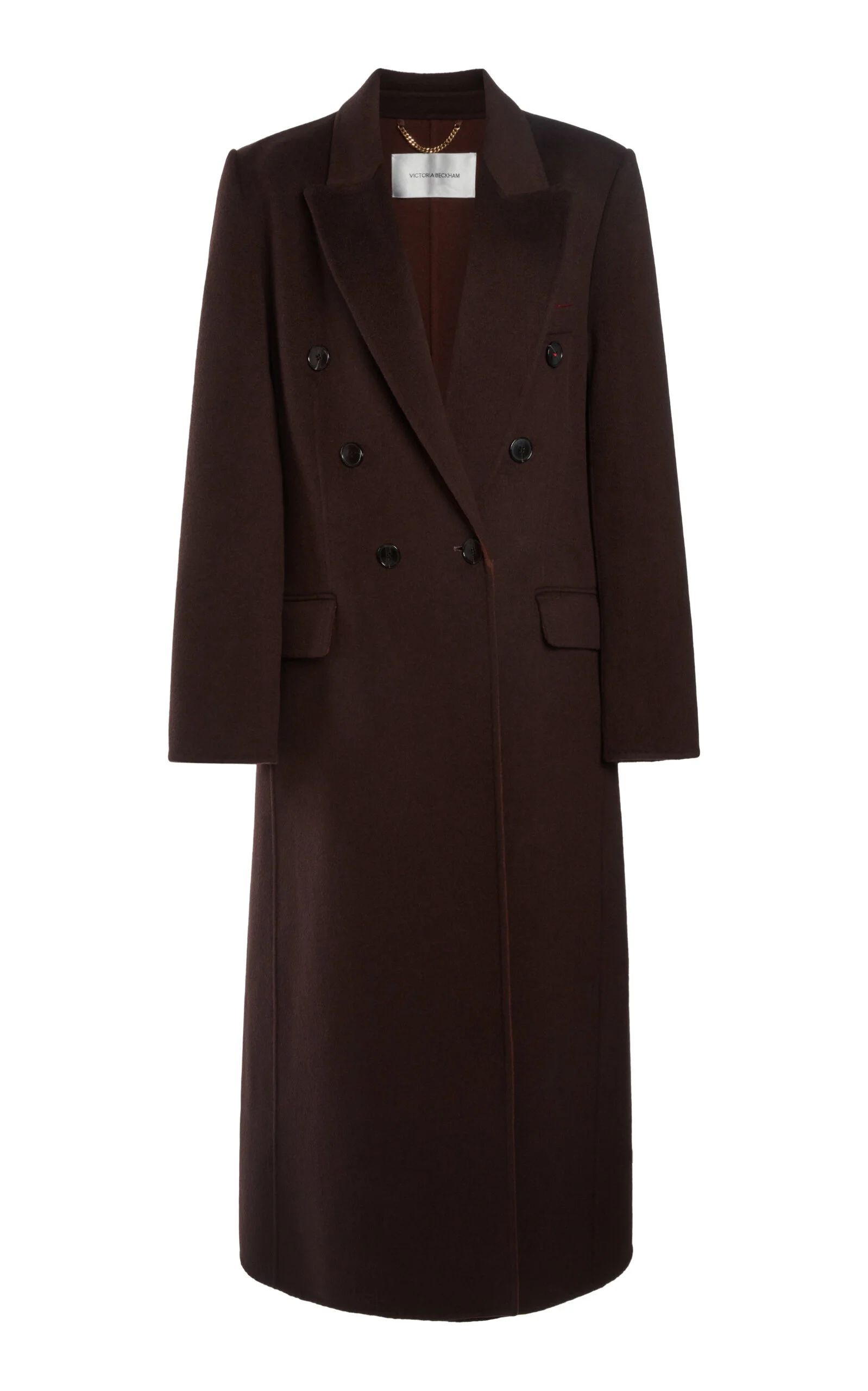 PRODUCT DETAILS - Long sleeve, double-breasted, flap pockets, A-line shape, maxi length - Button fastening through front - Lined - Composition: 95% Wool 5% Cashmere - Color: Dark Chocolate / Coco - Dry clean only - Pre-Fall '25