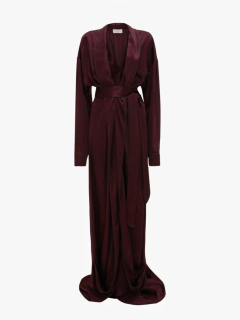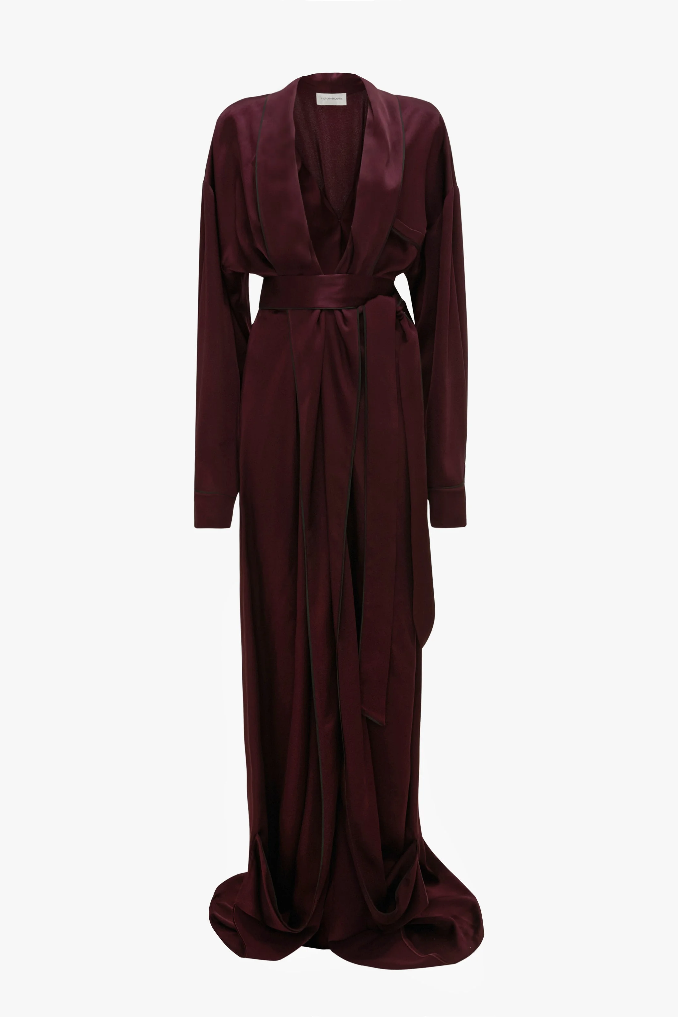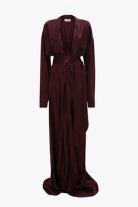 New to the house’s ready-to-wear edit, the Wrap Detail Gown in Merlot embodies the house’s signature unstudied elegance. Crafted from crepe back satin for an effortless drape, it has a distinctive shawl collar neckline, dropped shoulders and longer-length sleeves. The relaxed, oversized fit is balanced with intimate design details, including a waist belt with decorative piping, a front split in the skirt and pleat detail at the back of the waist. The Wrap Detail Gown offers a directional take on traditional evening wear. Size & Fit - Designed for a relaxed fit that cinches in at the waist, take your regular size - The model height is 5'11’’/180cm and is wearing a size 6 Product Details - Crepe back satin belted floor length dress - Shawl collar neckline with piping detail - Front chest pocket and belt with piping detail - Split at centre front skirt with tack detail at hem - 71% Acetate 29% Viscose - Dry clean only - Made in Portugal