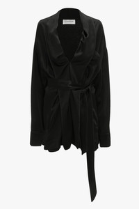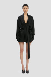 Crafted from crepe back satin, the Wrap Detail Mini Dress has a distinctive shawl collar, dropped shoulders and long sleeves with button-fastened cuffs. A pleated detail at the back of the waist brings a sexy tactility, while piping along the neckline, front chest pocket and wrap belt adds an elevated point of difference. Polished but playful, it brings a new sophistication to the traditional mini dress. Size & Fit - Designed for a relaxed fit that cinches in at the waist, take your regular size - The model height is 5'11’’/180.5cm and is wearing a size 6 Product Details - Crepe back satin belted mini dress - Shawl collar neckline with piping detail - Dropped shoulder with long sleeves and button fastening at cuff - Pleat details to back waist - Front chest pocket with piping detail - Belt with piping detail - 71% Acetate 29% Viscose - Dry clean only - Made in Portugal
