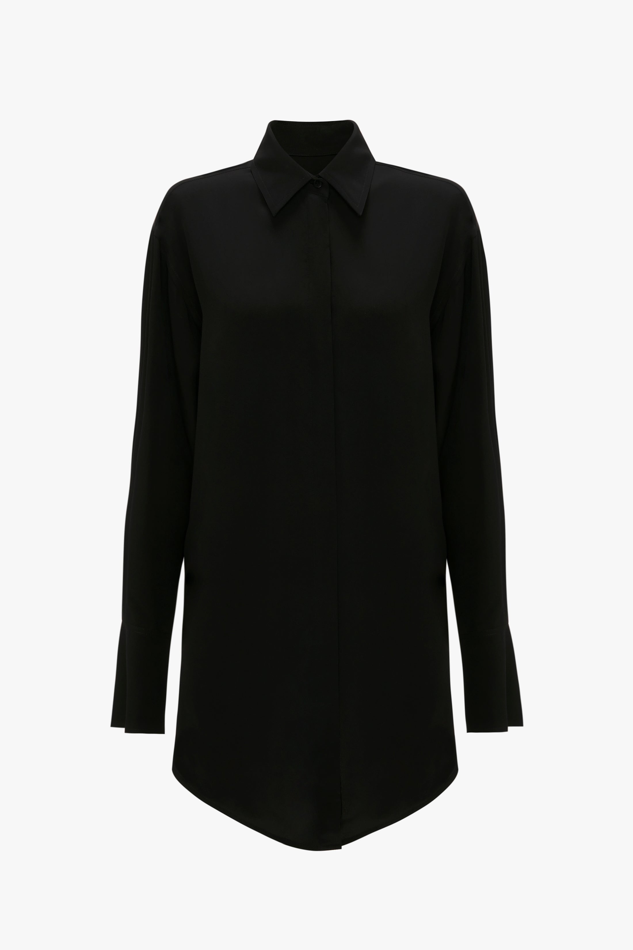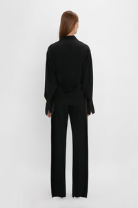 A modern take on the conventional button-front shirt, this 100% silk blouse has a wrap front that sweeps elegantly around the waist and fastens at the back. The oversized fit and dropped shoulder create a fluid silhouette that defines Victoria’s feminine take on traditional tailoring. Styled with the Satin Panel Straight Leg Trouser, Pointy Toe Stiletto, Jumbo Chain Earrings and Puffy Jumbo Chain Pouch Product Details - Crepe de Chine - Long Sleeve Shirt - Lower Front Crosses And Wraps Behind - Button Fastening at Back - Oversized Fit - The model height is 180cm and is wearing a size 6 - 100% Silk - Specialised Dry Clean Only - Made in Portugal