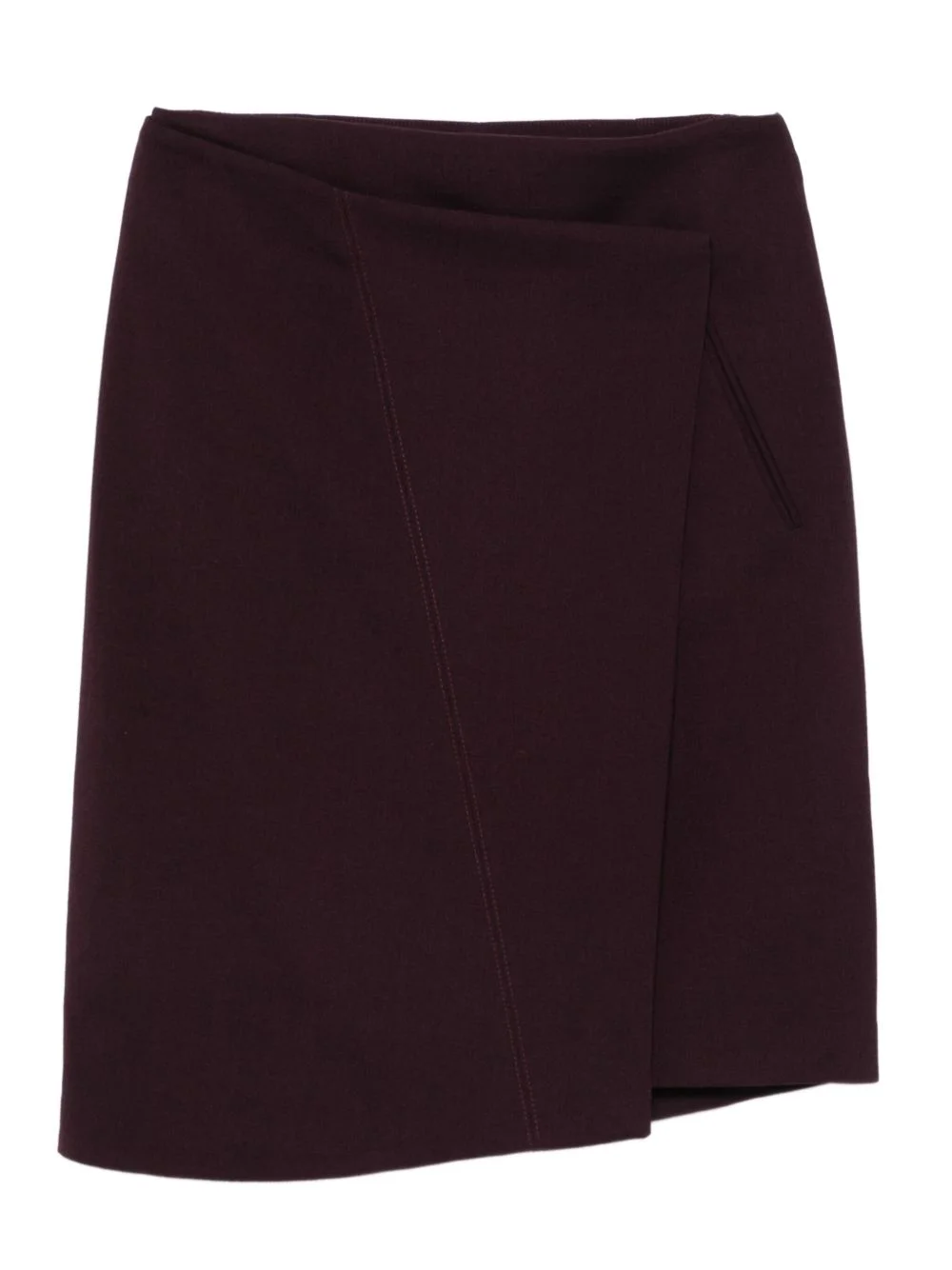 tailored wrap skirt Highlights - Dark red - Asymmetric hem - Seam detail Imported Composition Polyester 54%, Virgin Wool 44%, Elastane 2% SIZE & FIT Model measurements Height 5 ft 10 in(1.78 m) Bust/Chest 31.49 in(80 cm) Hips 37 in(94 cm) Waist 23.62 in(60 cm) Washing instructions Read Manufacturer Guidelines