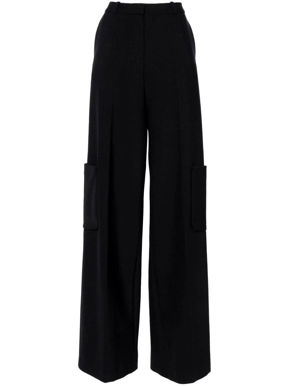 cargo-pockets wide-leg trousers Highlights - Navy blue - Interwoven design - Pressed crease - Dart detailing - High-waisted - Wide leg - Two diagonal pockets to the sides - Rear patch pocket - Two side cargo pockets - Belt loops - Concealed front button, hook and zip fastening - Unlined Imported Composition Polyester 52%, Wool 43%, Elastane 5% SIZE & FIT FittingInformation Designed with a wide-leg cut, these trousers allow for a close fit at the waist and offer a loose and roomy fit over the leg Particularly long in length; consider your own measurements Made from a midweight stretch fabric, this piece offers elasticity and flexibility when worn This piece fits true to size – take your usual size Washing instructions Dry Clean Only
