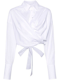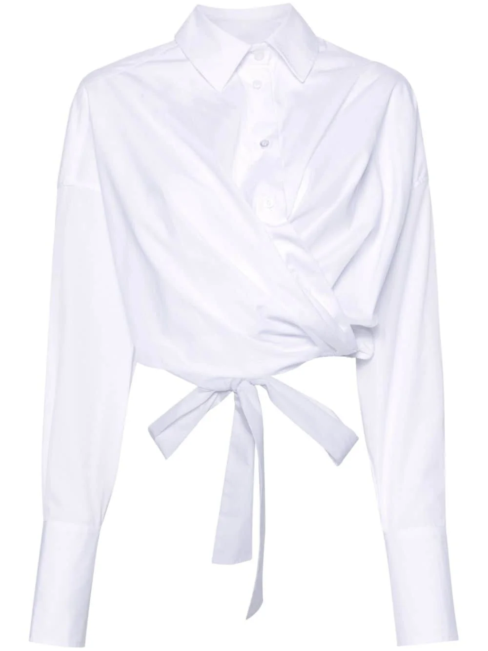 cropped wrap shirt Highlights - White - Poplin texture - Inverted pleat - Classic collar - Front button fastening - Drop shoulder - Long sleeves - Buttoned cuffs - Rear elasticated waistband - Tied waist - Wrap design - Cropped Imported Composition Nylon 85%, Polyester 15% SIZE & FIT Model measurements Height 5 ft 11 in(1.8 m) Bust/Chest 34.25 in(87 cm) Hips 35.82 in(91 cm) Waist 24.8 in(63 cm) FittingInformation Designed for a loose fit at the chest with a close fit over the waist and hips The elasticated waist allows for a comfortable fit Made from a midweight non-stretch fabric This piece fits true to size – take your usual size Washing instructions Dry Clean Only