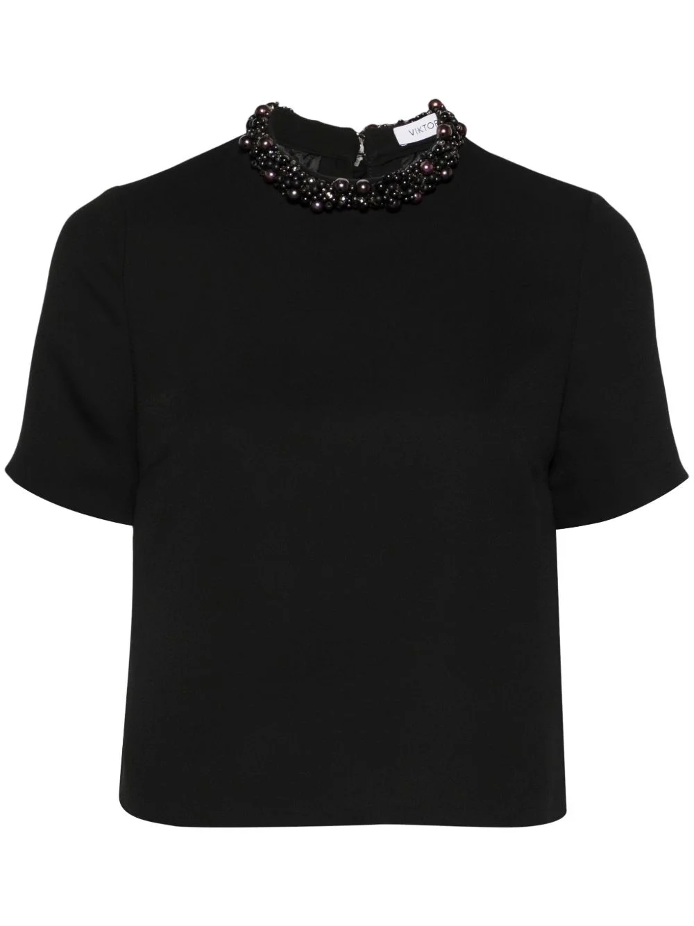embellished top Highlights - Black - Recycled polyester - Faux-pearl embellishment - Round neck - Short sleeves - Keyhole detail to the rear - Straight hem Imported Composition Recycled Polyester 100% SIZE & FIT FittingInformation Designed to be unstructured, offering a loose fit throughout Washing instructions Dry Clean Only
