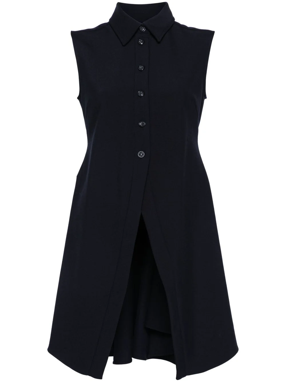 godet vest Highlights - Navy blue - Twill weave - Godet design - Classic collar - Sleeveless - Thigh-length - Unlined - Front button fastening Imported Composition Mother of Pearl 100%, Polyester 52%, Wool 43%, Elastane 5% SIZE & FIT Model measurements Height 5 ft 11 in(1.8 m) Bust/Chest 33.07 in(84 cm) Hips 37.4 in(95 cm) Waist 25.19 in(64 cm) FittingInformation Designed for a close fit at the chest and waist with a loose fit at the hip Made from a midweight stretch fabric, this piece offers elasticity and flexibility when worn This piece fits true to size – take your usual size Washing instructions Dry Clean Only