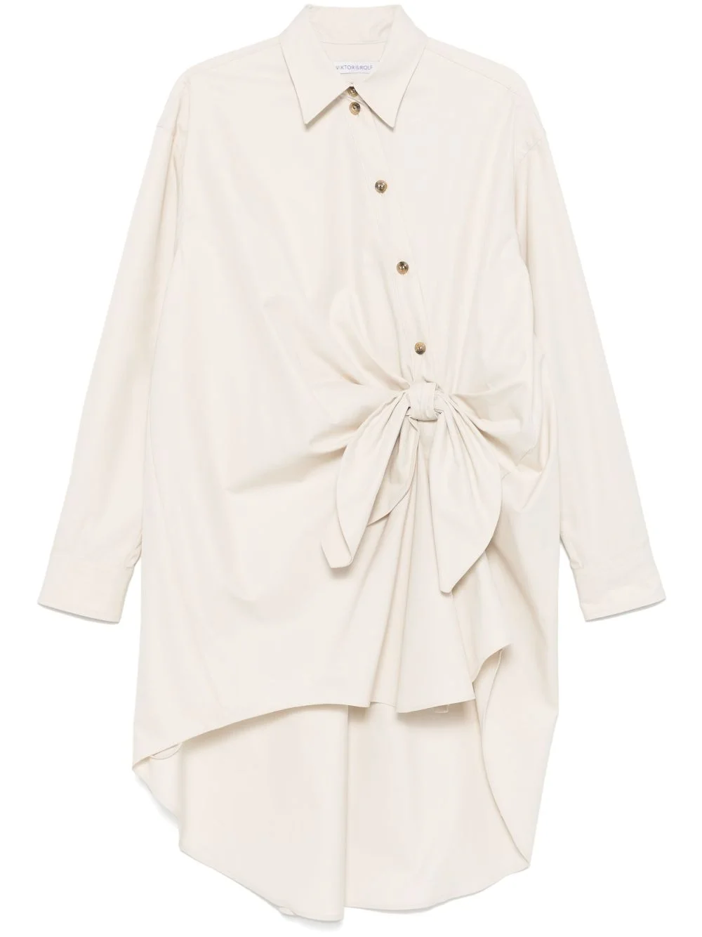 knotted mini shirt dress Highlights - Beige - Cotton - Textured finish - Knot detailing - Front button fastening - Classic collar - Long sleeves - Buttoned cuffs - Box-pleat detail - High-low hem - Thigh-length Imported Composition Cotton 100% SIZE & FIT Model measurements Height 5 ft 10 in(1.78 m) Bust/Chest 33.85 in(86 cm) Hips 36.61 in(93 cm) Waist 26.77 in(68 cm) FittingInformation Designed to be unstructured, offering a loose fit throughout Made from a midweight non-stretch fabric Washing instructions Dry Clean Only
