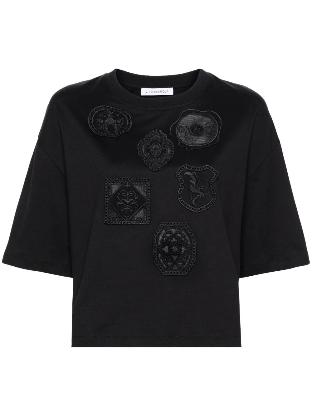 patch-embroidered cotton T-shirt Highlights - Black - Cotton - Jersey texture - Patchwork detailing - Embroidered design - Crew neck - Drop shoulder - Short sleeves - Straight hem Imported Composition Cotton 100% SIZE & FIT Model measurements Height 5 ft 10 in(1.78 m) Bust/Chest 29.92 in(76 cm) Hips 34.64 in(88 cm) Waist 23.62 in(60 cm) FittingInformation Designed for a relaxed fit, this piece allows for comfort and movement when worn Made from a midweight non-stretch fabric, this piece offers minimal elasticity when worn This piece fits true to size – take your usual size Washing instructions Dry Clean Only