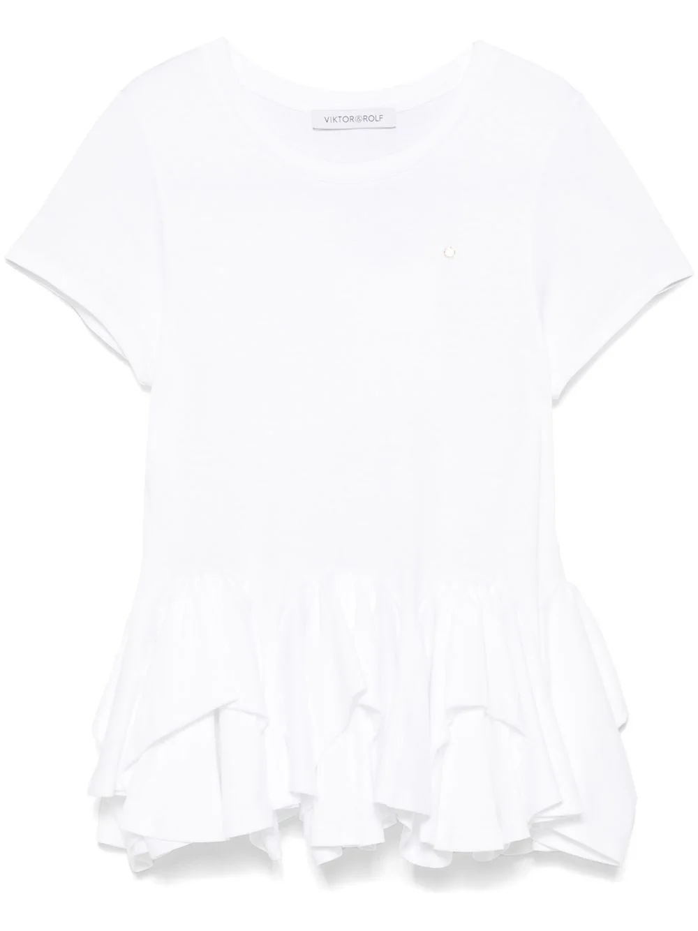 peplum-hem T-shirt Highlights - White - Cotton - Lightweight jersey - Peplum hem - Crew neck - Bead-logo detailing - Short sleeves - Unlined Imported Composition Cotton 100% SIZE & FIT Model measurements Height 5 ft 10 in(1.78 m) Bust/Chest 33.85 in(86 cm) Hips 36.61 in(93 cm) Waist 26.77 in(68 cm) FittingInformation Designed for a slim fit that sits just away from the body offering a close yet comfortable fit Made from a midweight non-stretch fabric, this piece offers minimal elasticity when worn Washing instructions Dry Clean Only