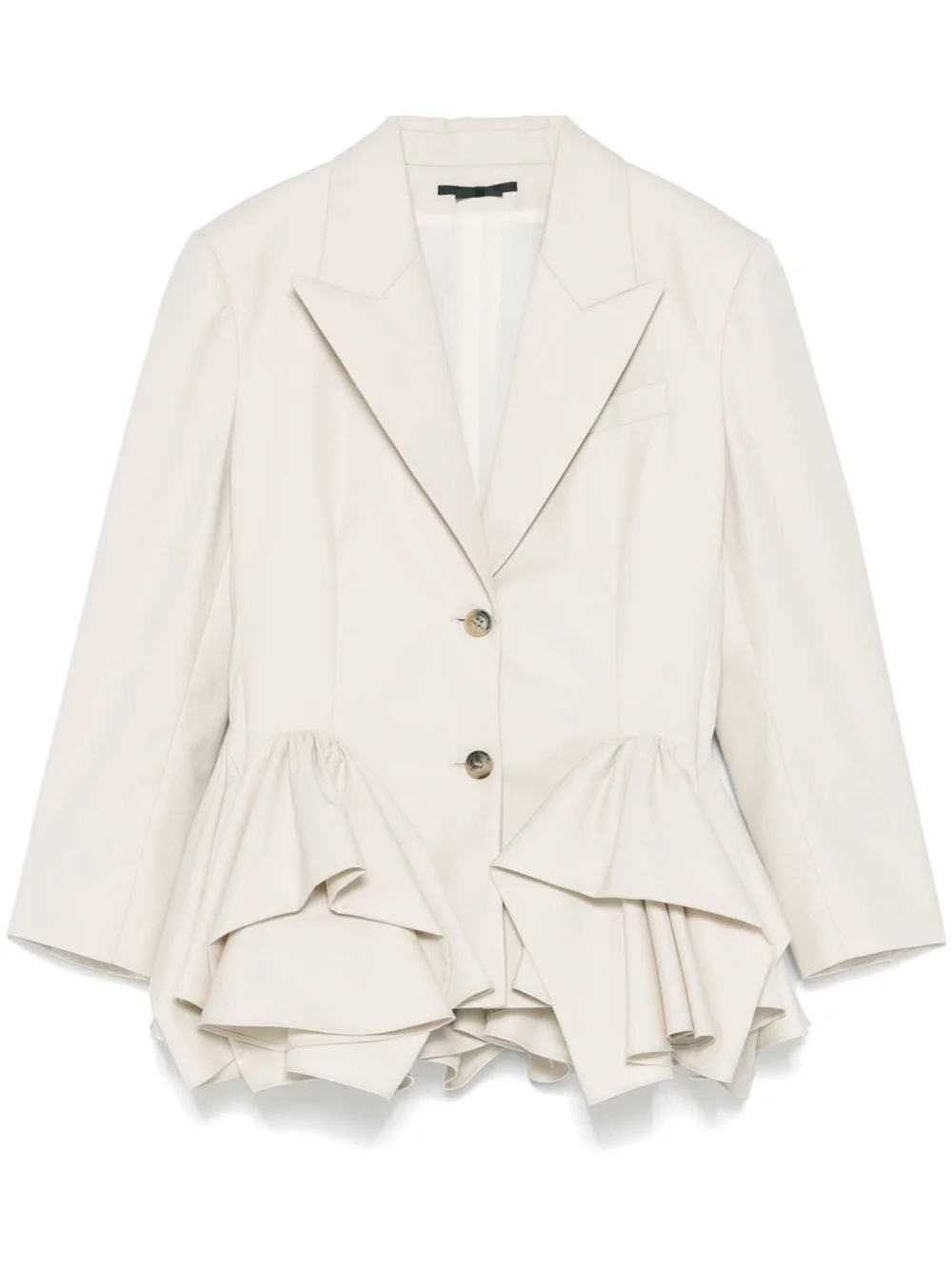 ruffled blazer Highlights - White - Cotton - Gabardine weave - Ruffle hem - Front button fastening - Peak lapels - Shoulder pads - Long sleeves - Buttoned cuffs - Chest welt pocket - Dart detailing - Peplum waist - Partial lining Made in Italy Composition Outer: Cotton 100% Lining: Cotton 100%, Viscose 100% SIZE & FIT Model measurements Height 5 ft 10 in(1.78 m) Bust/Chest 33.85 in(86 cm) Hips 36.61 in(93 cm) Waist 26.77 in(68 cm) FittingInformation Designed for a slim fit that sits just away from the body offering a close yet comfortable fit The internal shoulder pads offer a structured shape Made from a midweight non-stretch fabric Washing instructions Hand Wash