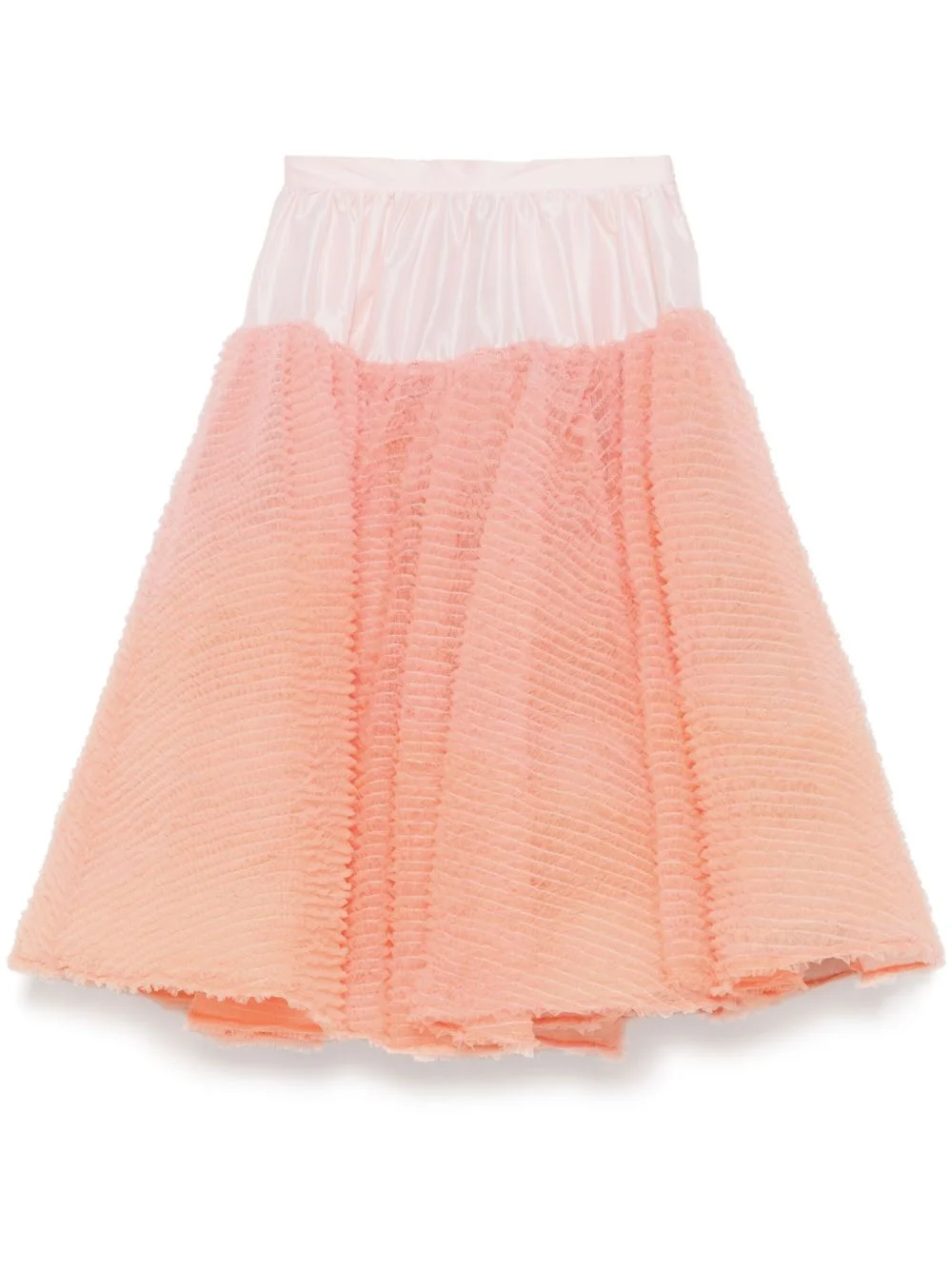 ruffled midi skirt Highlights - Peach pink - Taffeta - Fully-ruffled tulle panel - Concealed side hook and zip fastening - Panelled design - Voluminous skirt - Tulle lining - A-line - Peplum hem - Mid-length Imported Composition Polyester 69%, Silk 31% SIZE & FIT Model measurements Height 5 ft 10 in(1.78 m) Bust/Chest 33.85 in(86 cm) Hips 36.61 in(93 cm) Waist 26.77 in(68 cm) FittingInformation This midi-length skirt is intended to be worn high on the waist Made from a midweight non-stretch fabric Washing instructions Dry Clean Only