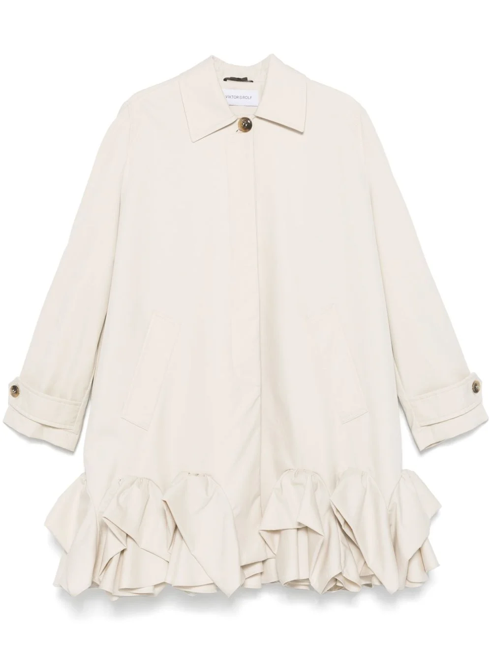 ruffled trench coat Highlights - White - Cotton - Gabardine weave - Ruffle hem - Concealed front button fastening - Spread collar - Long sleeves - Belted cuffs - Two side welt pockets - Logo-jacquard lining - Knee-length Imported Composition Lining: Viscose 100% Outer: Cotton 100% SIZE & FIT Model measurements Height 5 ft 10 in(1.78 m) Bust/Chest 33.85 in(86 cm) Hips 36.61 in(93 cm) Waist 26.77 in(68 cm) FittingInformation Designed to be unstructured, offering a loose fit throughout Made from a midweight non-stretch fabric Washing instructions Dry Clean Only