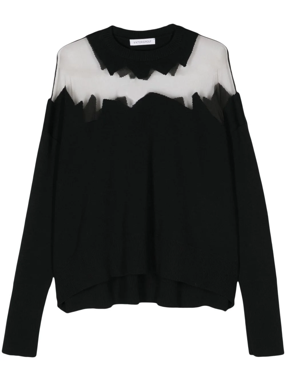 semi-sheer panel sweater Highlights - Black - Ribbed knit - Semi-sheer mesh panelling - Crew neck - Drop shoulder - Long sleeves - Ribbed cuffs and hem - Straight hem Imported Composition Other Fabrics 100% Washing instructions Dry Clean Only