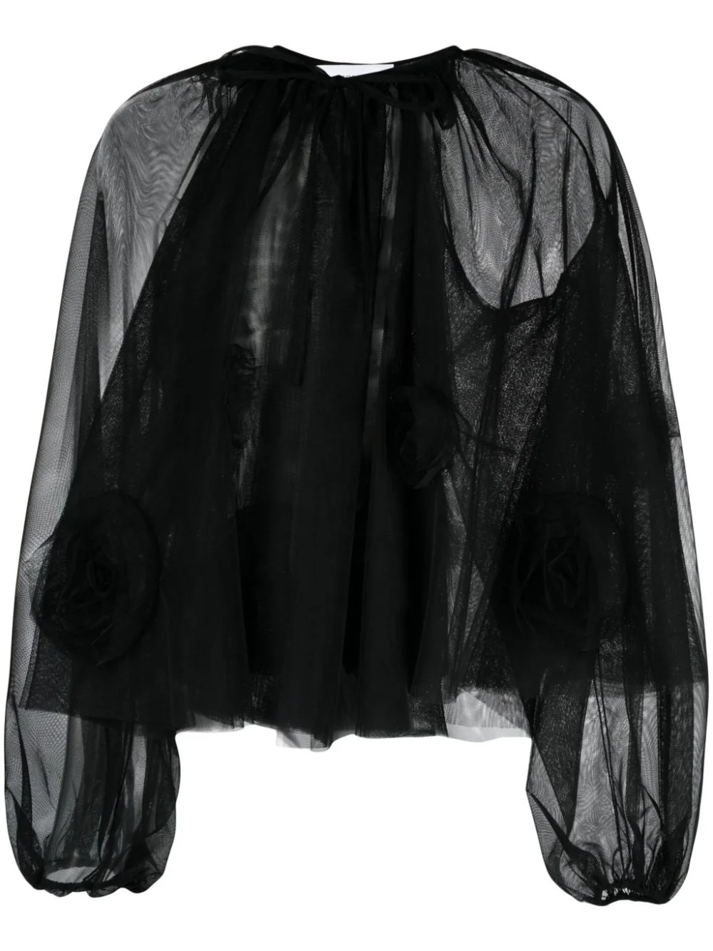 semi-sheer tulle top Highlights - Black - Tulle panels - Semi-sheer construction - Draped design - Balloon sleeves - Elasticated cuffs - Self-tie fastening Imported Composition Polyester 100% SIZE & FIT Model measurements Height 5 ft 10 in(1.79 m) Bust/Chest 32.67 in(83 cm) Hips 34.25 in(87 cm) Waist 24.4 in(62 cm) FittingInformation Designed to be unstructured, offering a loose fit throughout Made from a lightweight fabric This piece fits true to size – take your usual size Washing instructions Dry Clean Only