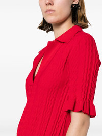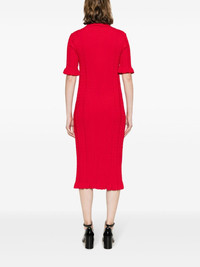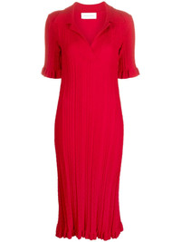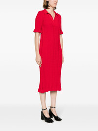 V-neck knitted midi dress Highlights - Red - Knitted construction - V-neck - Polo collar - Short sleeves - Flared hem - Calf-length Imported Composition Viscose 70%, Polyester 30% SIZE & FIT Model measurements Height 5 ft 10 in(1.79 m) Bust/Chest 32.67 in(83 cm) Hips 34.25 in(87 cm) Waist 24.4 in(62 cm) FittingInformation Designed for a slim fit that sits just away from the body offering a close yet comfortable fit Made with a midweight knit, this piece offers some stretch Washing instructions Dry Clean Only