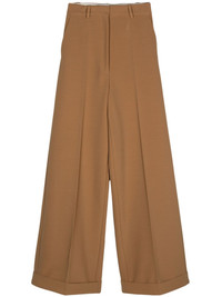 wide-leg trousers Highlights - Camel brown - Belt loops - Two diagonal pockets to the sides - Pressed crease - Two rear welt pockets - Turn-up cuffs - Wide leg - Concealed front button, hook and zip fastening Imported Composition Polyester 52%, Wool 43%, Elastane 5% Washing instructions Dry Clean Only
