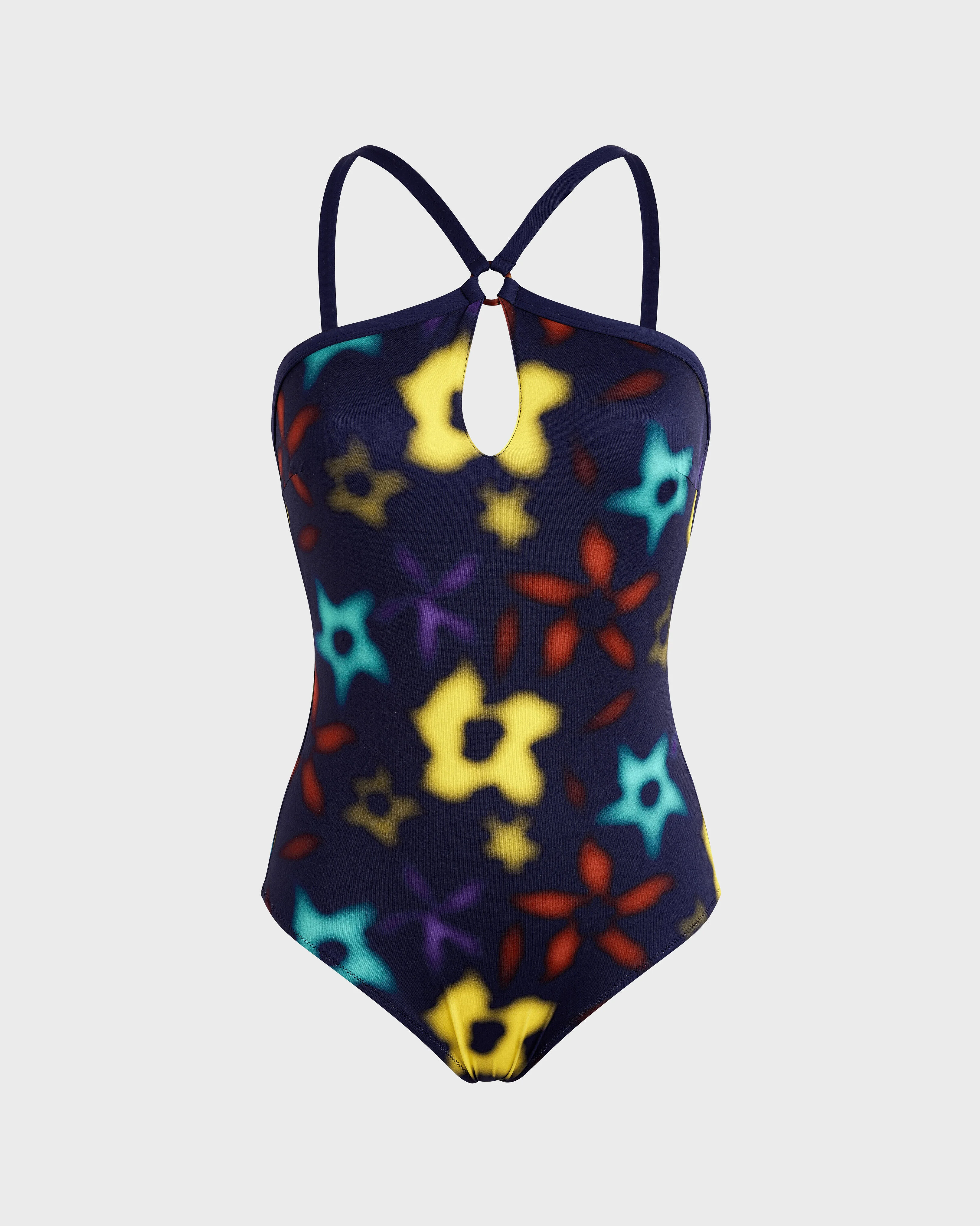 For maximum impact by the pool step out in this Blurred design women one-piece swimsuit. Structured for comfort in recycled polyamide and elastane, the straps feature as over-the-shoulder or halterneck. - Women one-piece swimsuit, very elegant and refine, printed with blurred flowers - Adjustable straps connected at the front to a tortoiseshell-look ring, offering a keyhole neckline. Straps are removable at the back to allow them to be tied at the neck for a backless look - Rounded low-cut back with a Turtle shell imitation Vilebrequin plate - Unpadded - Women One-piece Swimsuit Blurred - Women One-piece Swimsuit - 82% recycled polyamide 18% elastane Product Information Style: Feinte Model: FEQBH311-390 Color: NAVY / BLUE