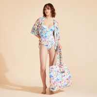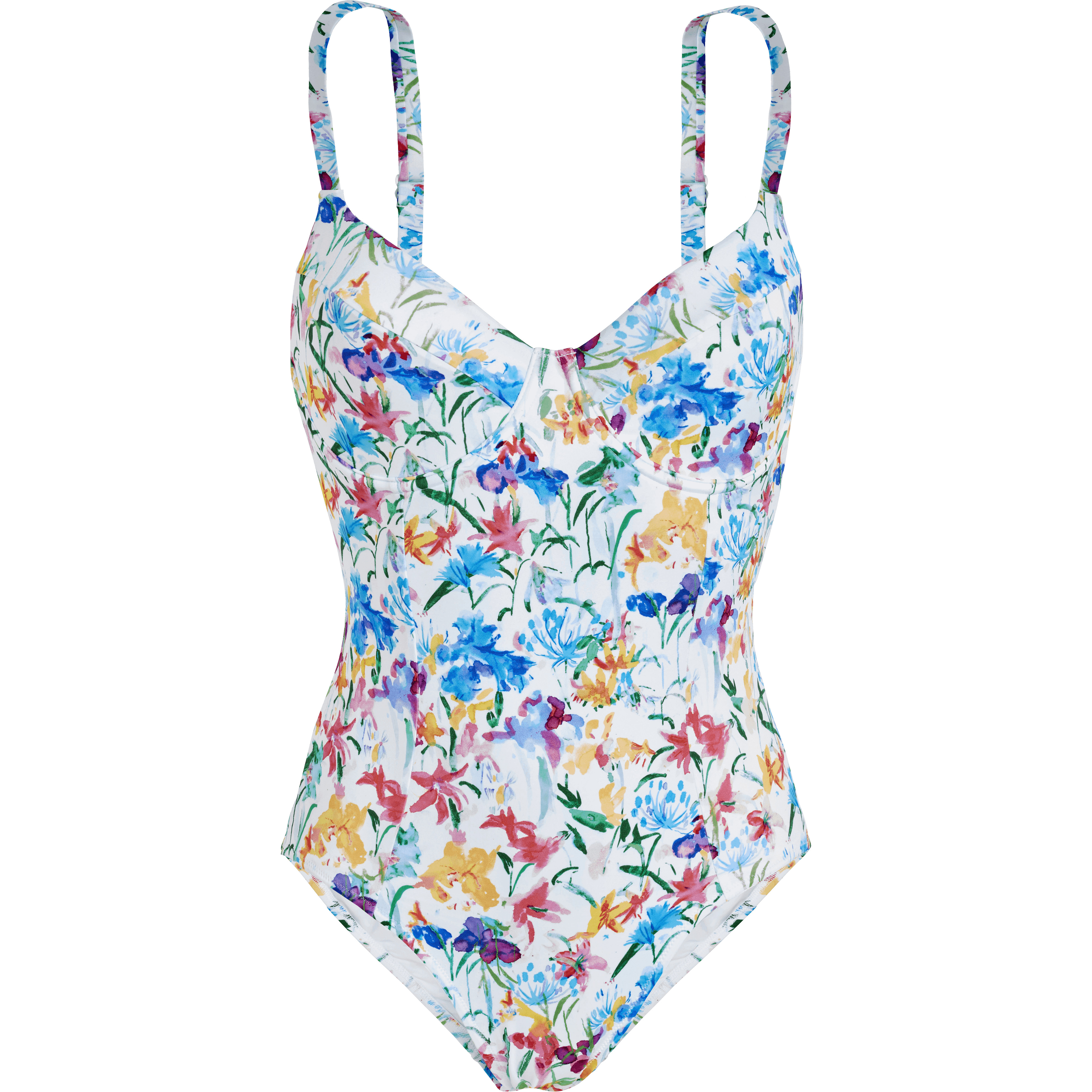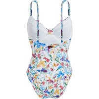 The V-neck of this bustier accentuates the shape while adjustable straps and recycled polyamide and elastane offer a comfortable fit. - Bustier One-piece - Adjustable straps not removable - With frames, without padding - V-shaped neckline - Vintage inspiration - B cup for size S - Women One-piece Swimsuit - Women One-piece Swimsuit Happy Flowers - 82% Recycled Polyamide - 18% Elastane