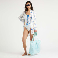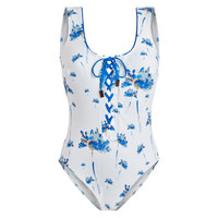 A stylish women one-piece floral swimsuit that flatters the body shape with a scooped neckline to lace up. A daring front slit adds a touch of sophistication to this recycled polyamide and elastane women one-piece swimsuit - Women one-piece swimsuit - Scooped neckline front and back - Front slit and lacing - Removable padding - Women One-piece Swimsuit - Women One-piece Swimsuit Herbier - 82% Recycled Polyamide - 18% Elastane Product Information Style: Fox Model: FOXAH261-003 Color: OFF WHITE / WHITE