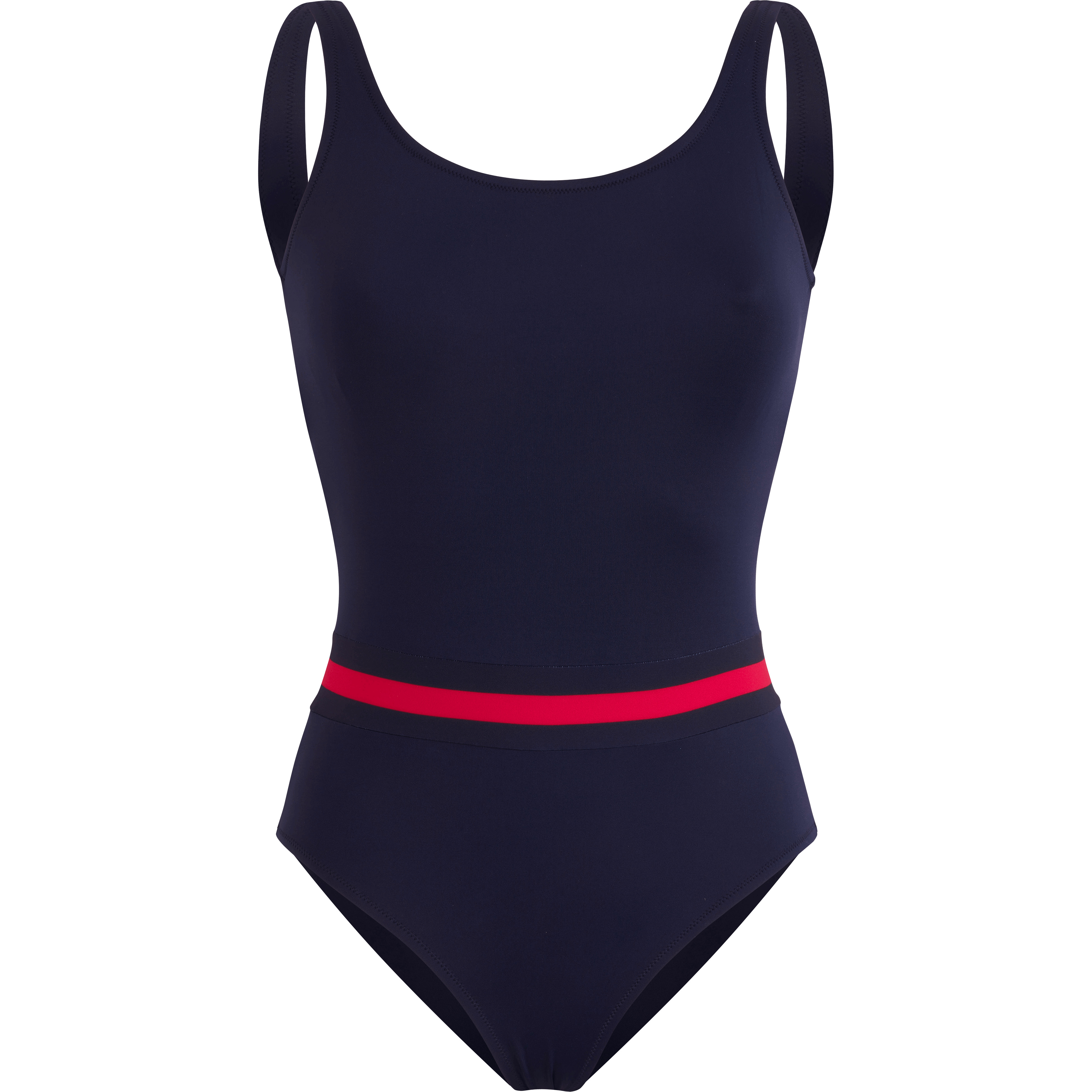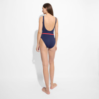 Embrace 80s style with this women’s one-piece recycled polyamide and elastane swimsuit. The navy blue and red striped belt accentuates the waist, while the deep back neckline adds allure. - 80s Style - Navy blue and red striped printed belt to mark waistband - Lined with removable padding - Deep back neckline - Women One-piece Swimsuit - Women One-piece Swimsuit Solid -Vilebrequin x Ines de la Fressange - 82% Recycled Polyamide - 18% Elastane
