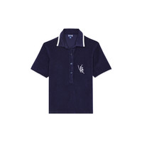 A relaxed-look terry polo shirt with contrasting cuff and collar edging. Buttons at the front and features the VBQ signature on the chest. - Terry cloth polo for women - Deep buttoned neckline - Contrasting trim on the collar and sleeve cuffs - VBQ signature embroidery on the chest - The model is 5'9.29" and wears a S size - Women Polo - Women Polo Vilebrequin - 86% organic cotton 14% nylon Product Information Style: Lizea Model: LZACQ101-390 Color: NAVY / BLUE