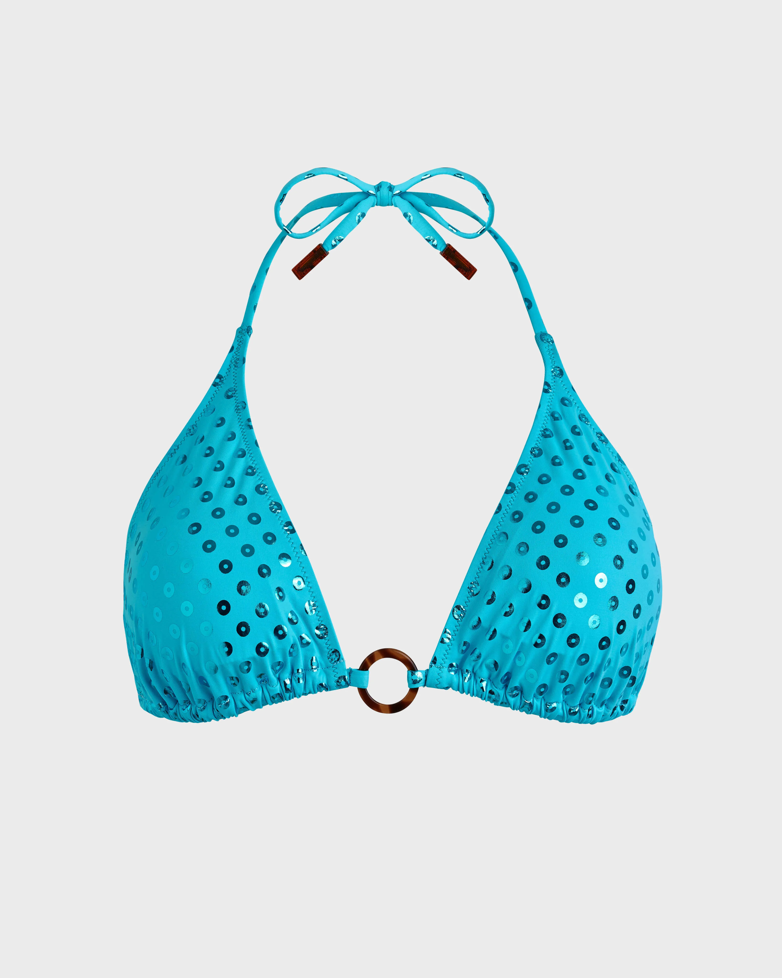 Adding a chic touch to any summer wardrobe, this textured triangle bikini top dazzles with a shimmering sequin effect, evoking the glamour of disco groove. Featuring the iconic turtle ring, it is crafted from polyamide and elastane for a figure-hugging fit that enhances your silhouette with a radiant glow. - Triangle mini bikini top - To tie in the neck and back - Ring turtle scale like at the middle front - Removable paddings - Lined - Women Bikini - Women Bikini Relief Sparkling - 80% polyamide 20% elastane Product Information Style: Flox Model: LOXCH871-431 Color: DISCO GREEN / GREEN