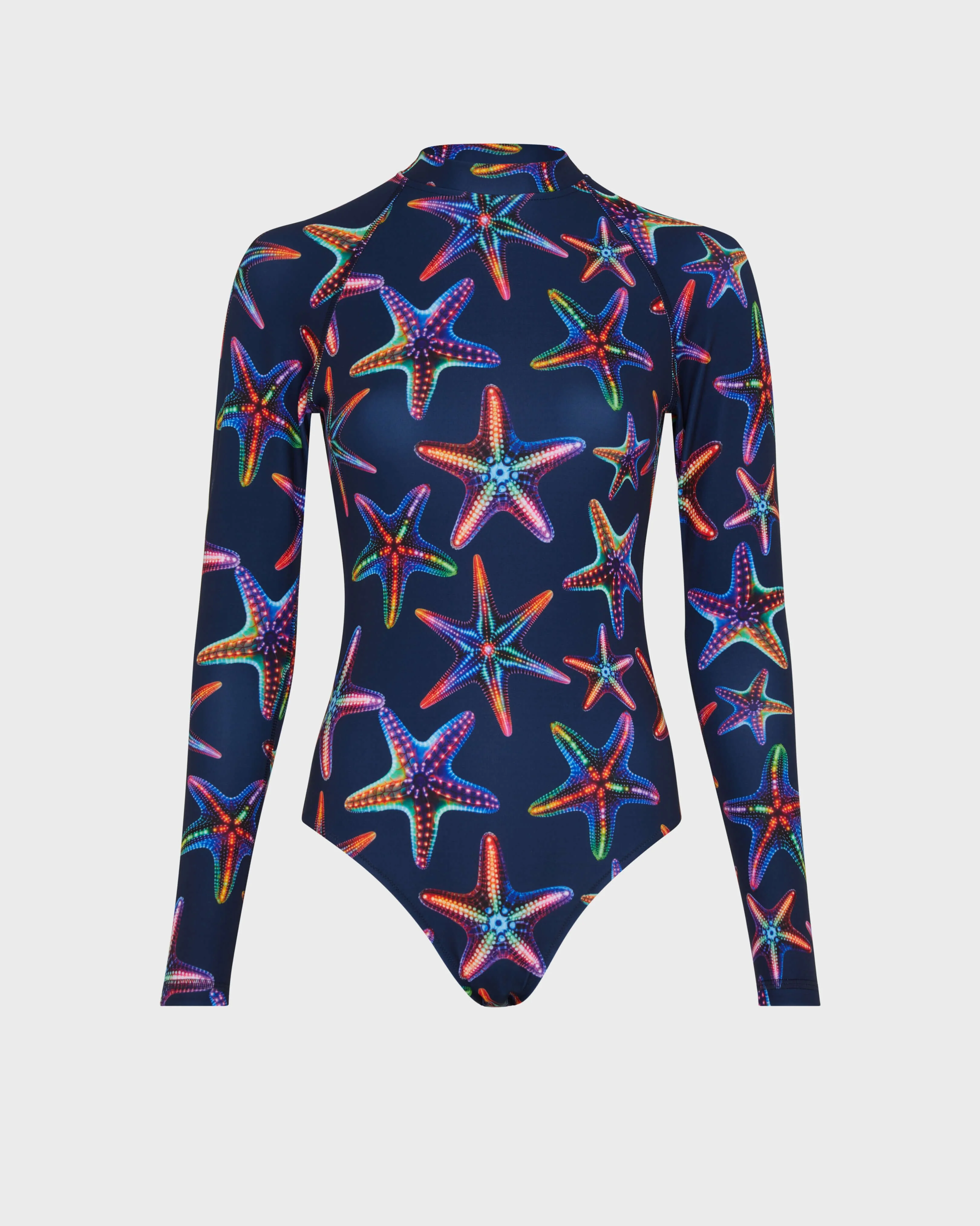 Cut from stretchy fabric for a flattering shape, this Disco Stars design rashguard promises style in and out of the water. Offers UV protection, a high neck and long sleeves. - Long-sleeve anti-UV one-piece swimsuit for women - High neck - Back zipper - Stretch jersey fabric - The model is 5'8.9" and wears a S size - Women Rashguard One-piece Swimsuit - Women Rashguard One-piece Swimsuit Disco Stars - 73% polyester 27% elasthane Product Information Style: Lexane Model: LXXCH207-390 Color: NAVY / BLUE