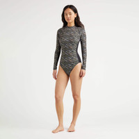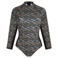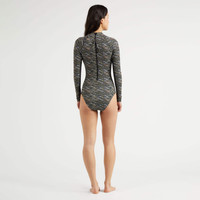 Make an entrance in this captivating pearl print women rashguard swimsuit. Fashioned from polyester and elastane for the perfect fit, this piece is almost too sophisticated to wear in the water. - Women Long-sleeve one-piece swimsuit - High neck - Long raglan sleeves - Back zip - Unpadded - Side cut-out detail with band - Waffle fabric - Women Rashguard Swimsuit Pearl - The model is 68.8" tall and wears a size S - Women Rashguard Swimsuit - 91% polyester 9% elastane Product Information Style: Lexya Model: LXABR313-990 Color: BLACK / BLACK