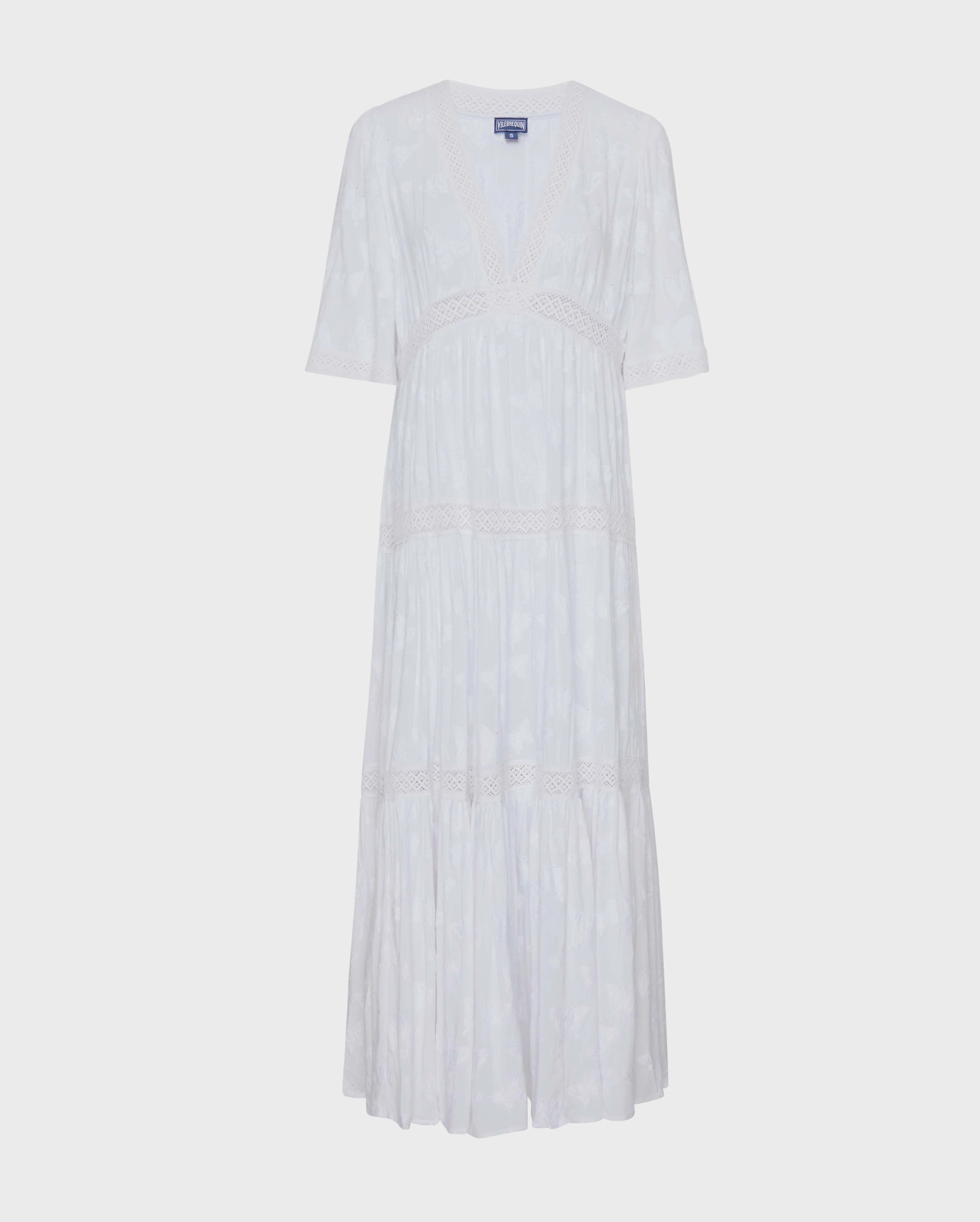 Rock the Ibiza vibe in this long dress crafted from viscose for cool comfort. Adorned with butterflies and featuring lace inserts to add a touch of romantic style. - Hippie-chic long dress for women - Short and larges sleeves with gathers - Long "V" neckline - Cutouts with inseted lace braid - Women Dress - Women Dress Embroidered Disco Butterflies - 100% viscose