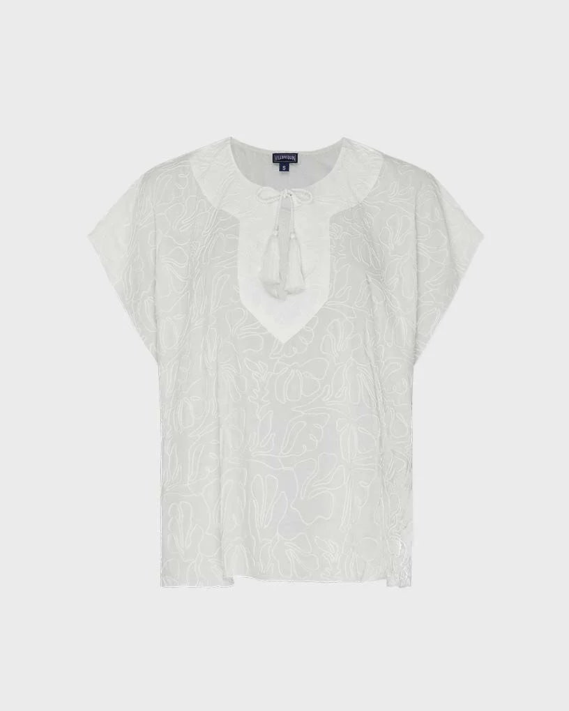 Product Detail 100% viscose A floaty summer top inspired by the Mediterranean breezes of the West Coast. Cut from cool viscose and embroidered with Seashells to flatter in a relaxed style. - Tie at chest decorated with tassels - Flutter butterfly sleeves - Resistant to wrinkles, requires little ironing - Viscose offers a cool sensation on the skin, ideal for hot weather - The model is 5'9 and wears a S size - Women Shirt - Women Shirt Seashells Care To take care of your Shirt we advise you to follow our suggestions below: - Do not wash - Do not bleach - Do not tumble dry - Do not iron