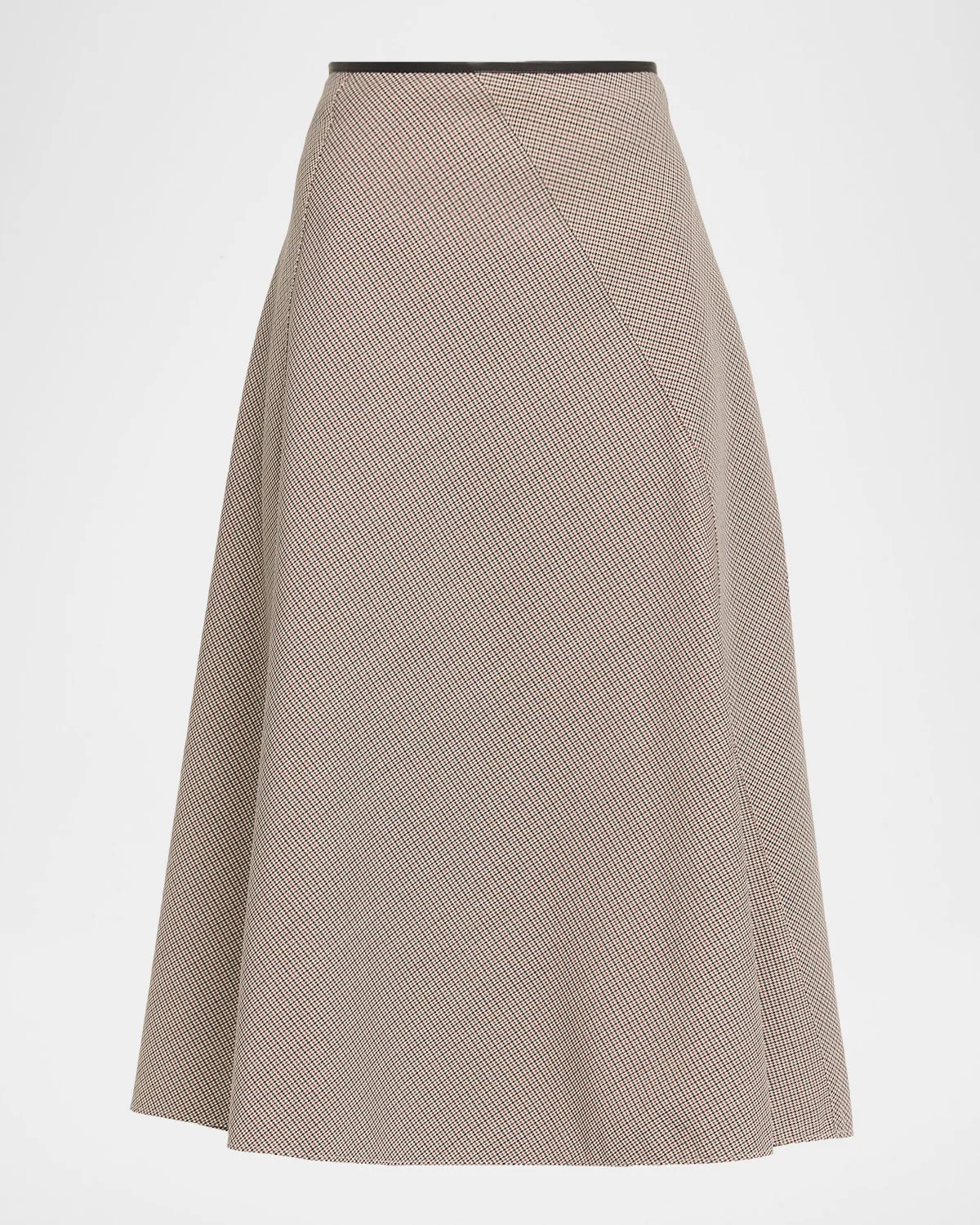 Plaid woolblend skirt elevated with asymmetric seams by Vince. High rise Circlecut silhouette Hem falls below the knee Center back zip Wool/polyester Hand wash or dry clean Imported