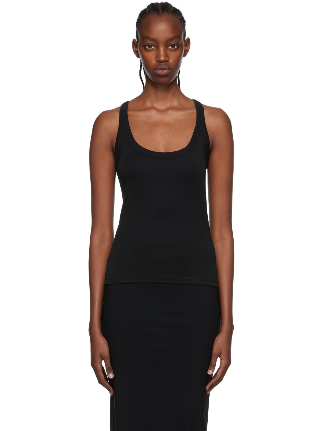 Pima cotton jersey camisole. Rib knit scoop neck and arymscyes. Supplier color: Black 100% pima cotton.