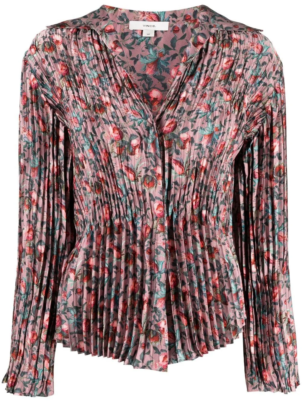 berry blooms pleated shirt rose pink/rose red/emerald green all-over floral print fully pleated V-neck spread collar long sleeves curved hem Imported Composition Polyester 100% SIZE & FIT Model measurements Height 5 ft 10 in(1.78 m) Bust/Chest 33.46 in(85 cm) Hips 35.43 in(90 cm) Waist 24.4 in(62 cm) Washing instructions Hand Wash