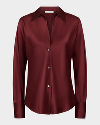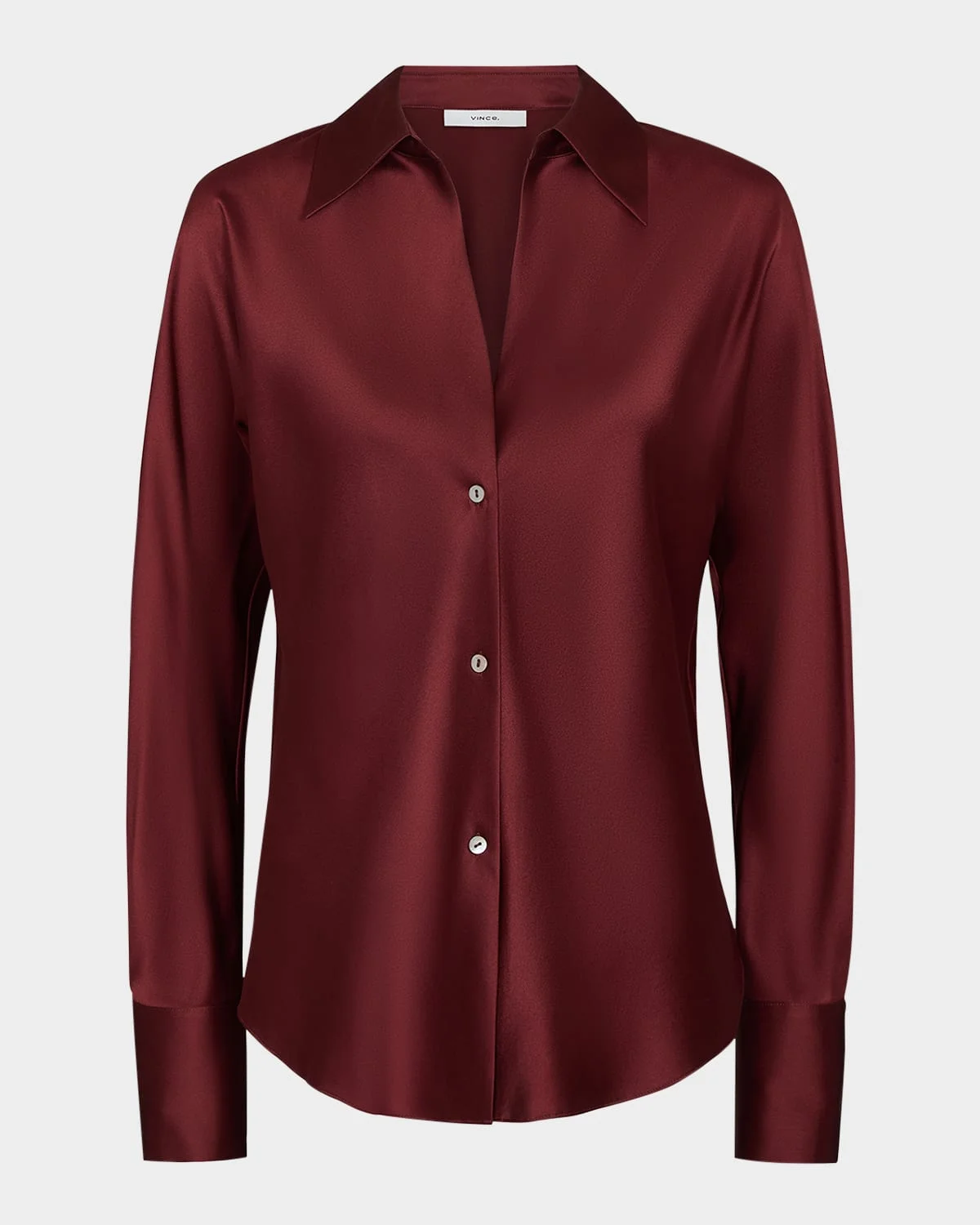 Vince biascut blouse rendered from silk charmeuse Spread collar; button front Long bishop sleeves Barrel button cuffs Curved hem Draped fit Silk Dry clean Imported