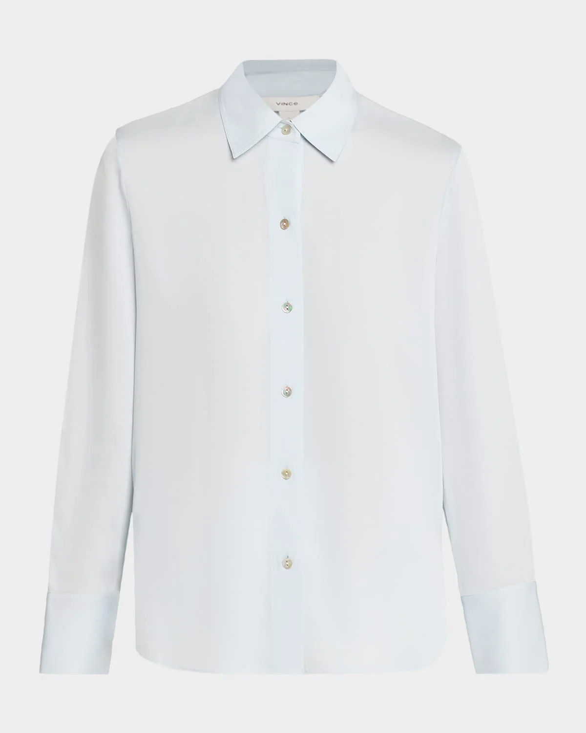 Vince solid silk blouse Point collar Long sleeves with button cuffs Classic fit Hem falls to the hip Buttonfront Silk/elastane Hand wash or dry clean Imported