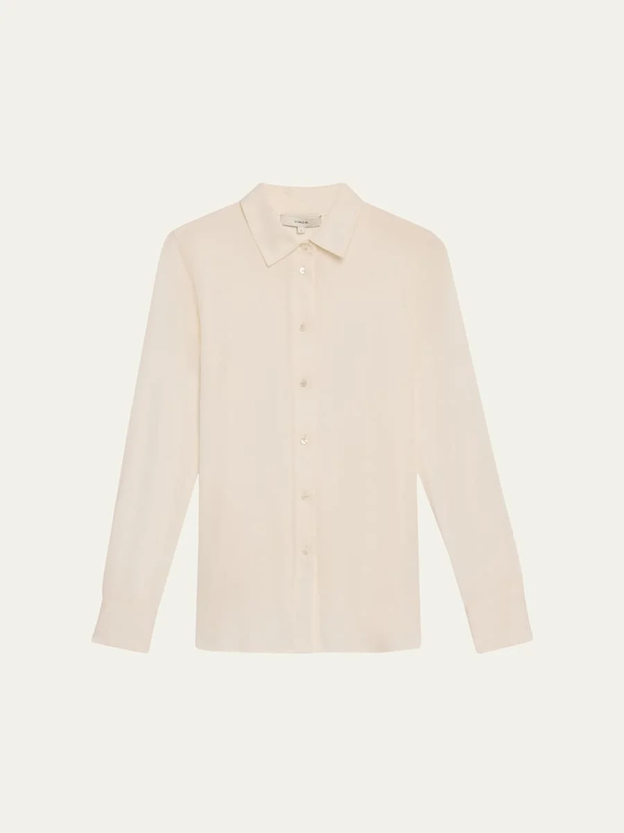 Vince solid silk blouse Point collar Long sleeves with button cuffs Classic fit Hem falls to the hip Button-front Silk/elastane Hand wash or dry clean Imported Online Inquiries: BGS21_T6DYS| Store Inquiries: #4966786