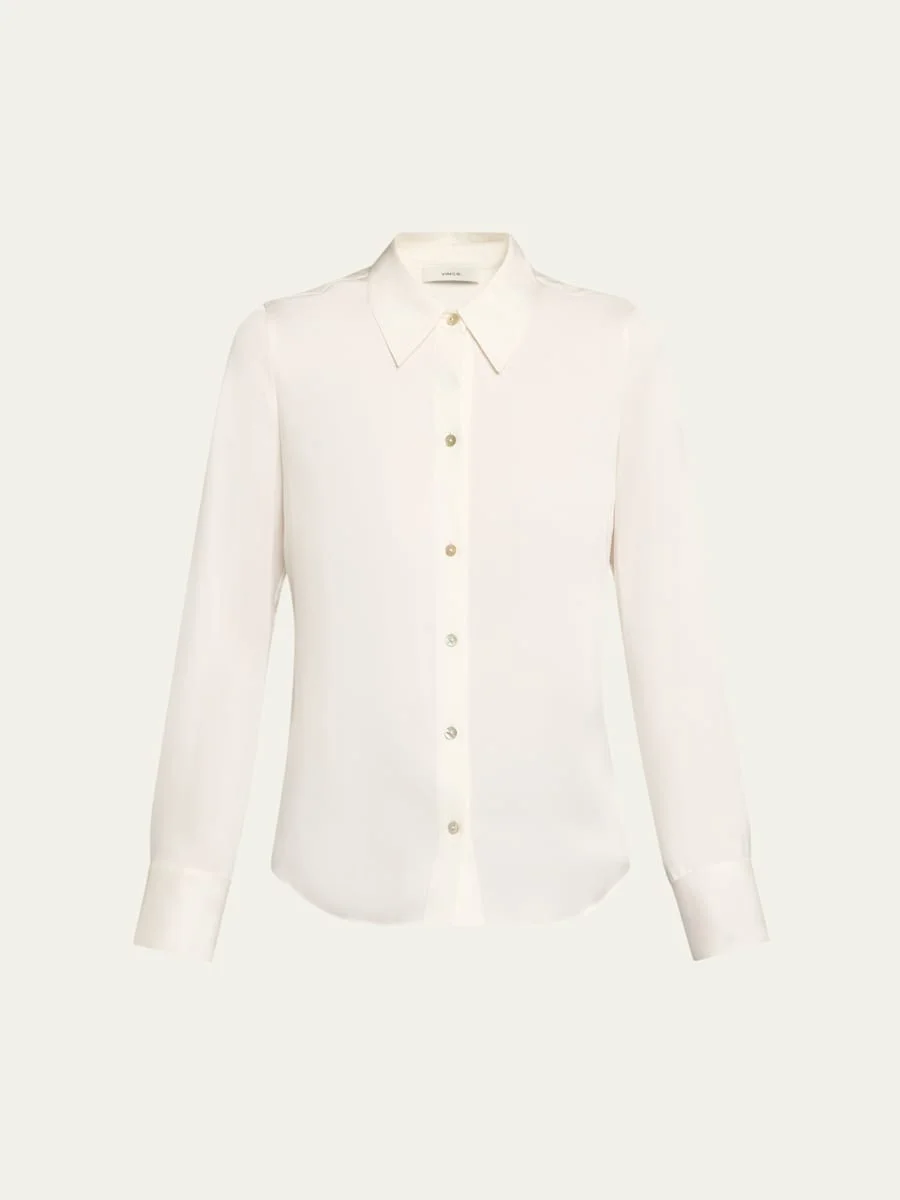 Vince classic stretch silk shirt Point collar Long sleeves with button cuffs Slim fit Hem falls to the hip Button-front Silk/viscose/spandex Hand wash cold or dry clean Imported Online Inquiries: BGS21_T6TYR| Store Inquiries: #5034980