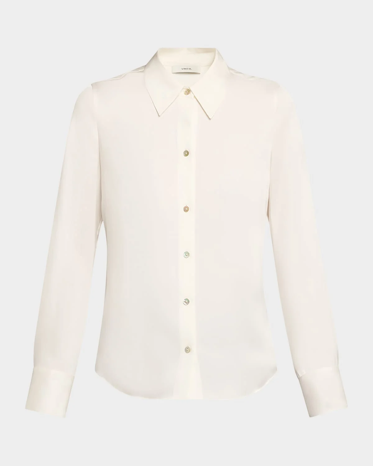 - Vince classic stretch silk shirt - Point collar - Long sleeves with button cuffs - Slim fit - Hem falls to the hip - Button-front - Silk/viscose/spandex - Hand wash cold or dry clean - Imported