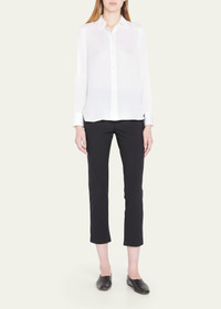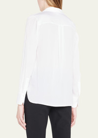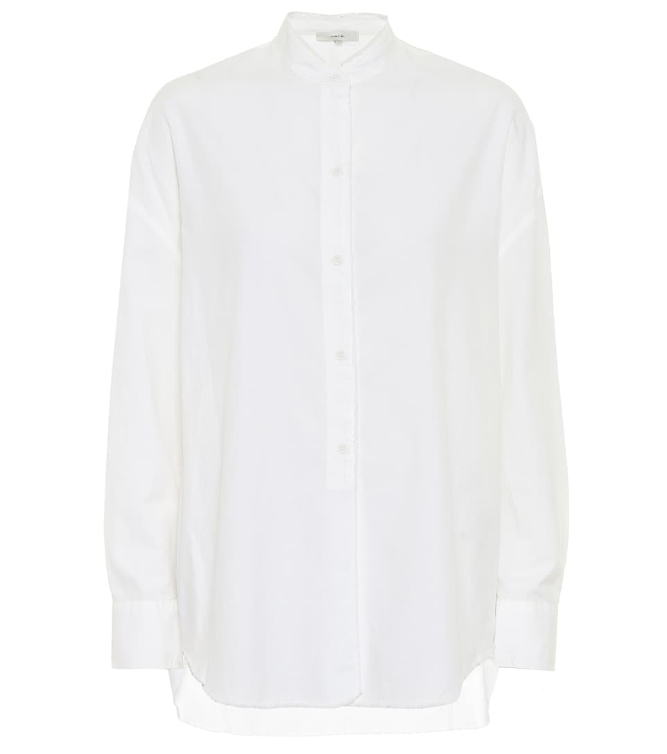 Look to Vince for elevated installments to your basics offering, such as this white shirt. Made from cotton-blend poplin, which incorporates silk for added luster, it has a relaxed silhouette with a grandad collar and dropped shoulders. Style yours with wide-leg pants for a laid-back look. Product Details - Material: 14% silk, 86% cotton - Care instructions: machine wash cold - Designer color name: White - Buttoned cuffs - Closure: buttoned front - Item number: P00524626 Size & Fit - True to size - Dropped shoulders - Oversized - Lightweight material - Falls below the hip - The model seen in the picture is 178cm-5'10" and wearing a size XS