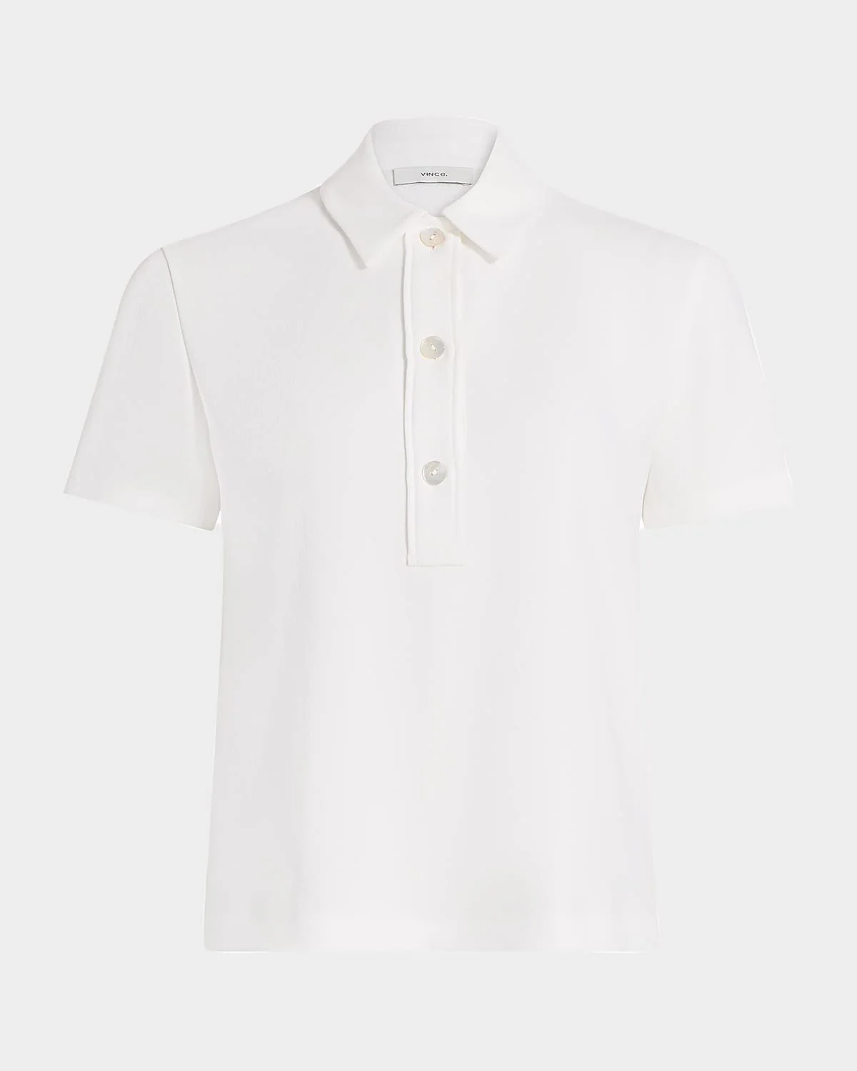 Vince sleek polo shirt crafted from crisp crepe and finished with delicate shell buttons & nbsp; Spread collar; button-placket & nbsp; Short sleeves Classic fit Hem falls to the hip & nbsp; Polyester Unlined Hand wash or dry clean Imported