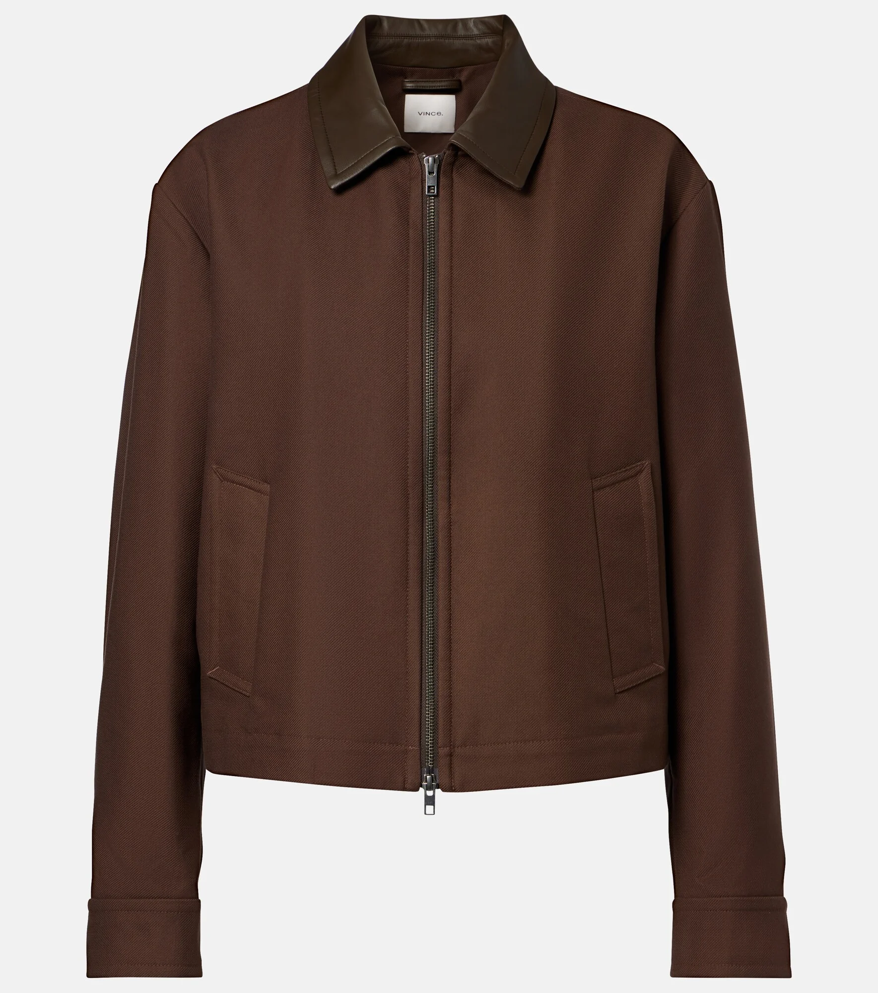 Look to Vince when building a timeless wardrobe of elevated yet understated styles. Carefully crafted from cotton twill, this jacket is a slightly cropped piece with tonal leather trims. Product Details - Material: 100% cotton - Care instructions: dry clean - Made in Thailand - Color: brown - Designer color name: Willow - Trim: 100% lamb leather - Contains non-textile parts of animal origin - Lining: 100% cotton - Filling: 100% polyester - Pockets: side welt pockets, internal pocket - Closure: two-way zipped front - Collar: classic (Straight point) - Cuff: one button - Item number: P01153822 Size & Fit - Fits large to size - we recommend trying one size smaller - Straight fit - Non-stretchy fabric - Falls to the hip - The model seen in the picture is 178cm-5'10" and wearing a size XXS