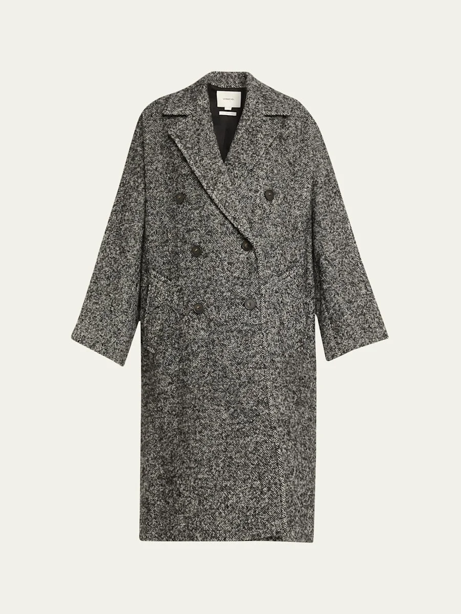 Overcoat crafted from melange woolblend by Vince. Wide notch lapels Doublebreasted front Long sleeves with button cuffs Side pockets Classic fit Hem falls below the knee Buttonfront Wool/polyester/acrylic Lining: Polyester Dry clean Imported