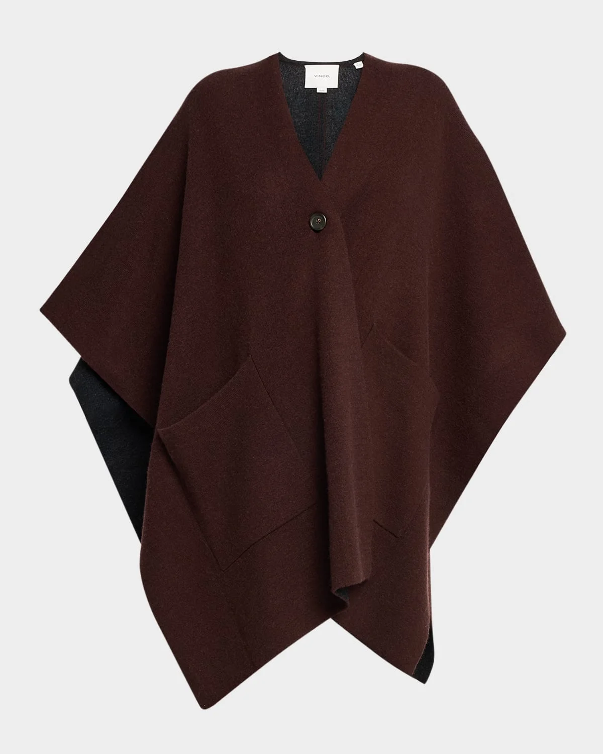 Vince doublefaced cape in wool and cashmere Approx. 45"L x 30"W Button closure Deep pockets Side vents Dry clean, hand wash Imported