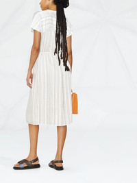Drapey stripe shirred dress Presented in off white and vista blue tones, this short-sleeved midi dress from Vince is decorated with a vertical stripe print all over and finished with a tied waist. Imported Composition Outer: Rayon 79%, Nylon 20%, Polyester 1% Lining: Polyester 100% SIZE & FIT Model measurements Height 5 ft 10 in(1.78 m) Bust/Chest 30.31 in(77 cm) Hips 36.61 in(93 cm) Waist 24.8 in(63 cm) FittingInformation This piece fits true to size. We recommend you get your regular size Cut for a loose fit Made with a mid-weight non-stretch fabric Washing instructions Dry Clean Only